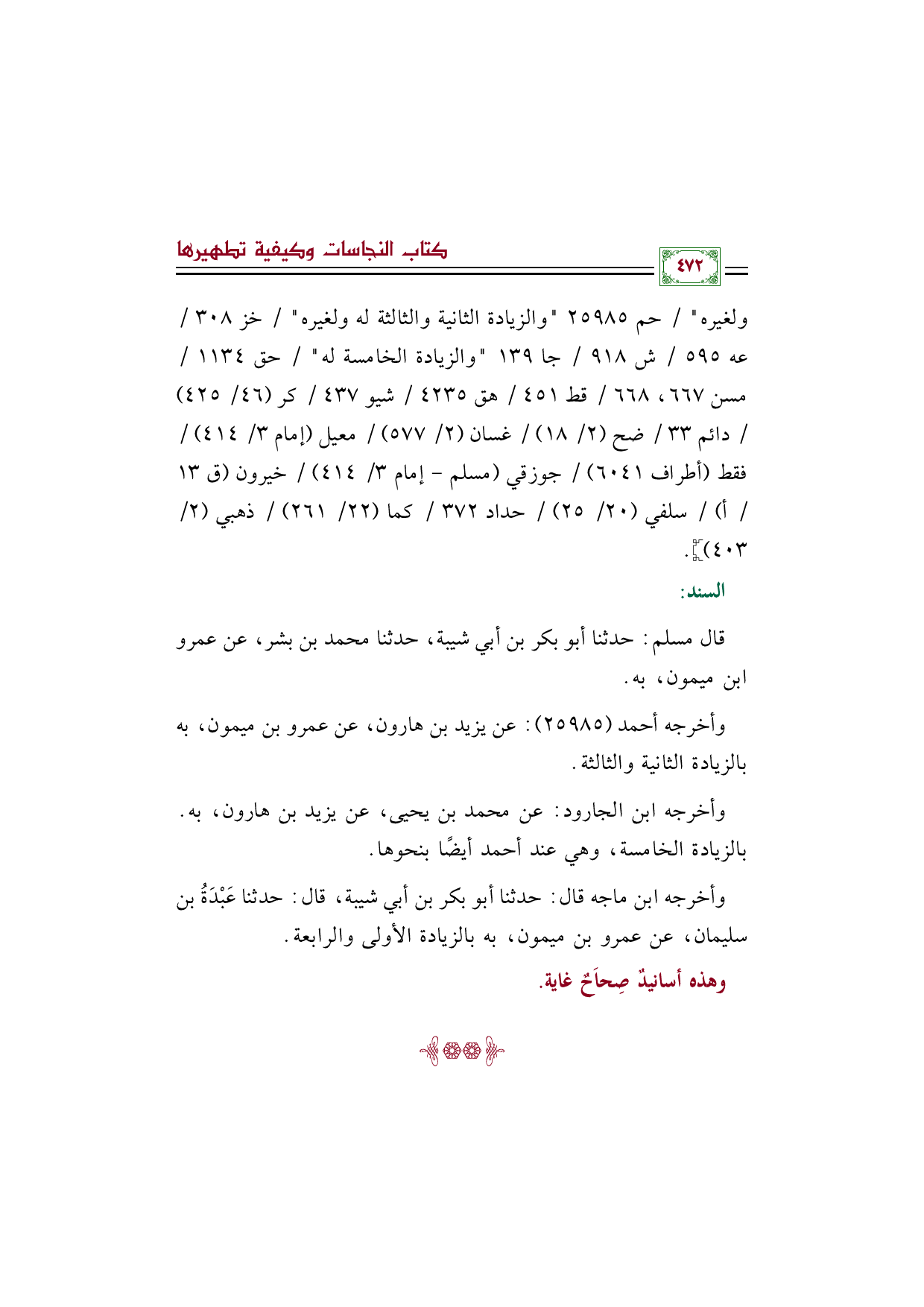 وأخرجه ابن ماجه قال: حدثنا أبو بكر بن أبي شيبة، قال: حدثنا عَبْدَةُ بن سليمان، عن عمرو بن ميمون، به بالزيادة الأولى والرابعة.