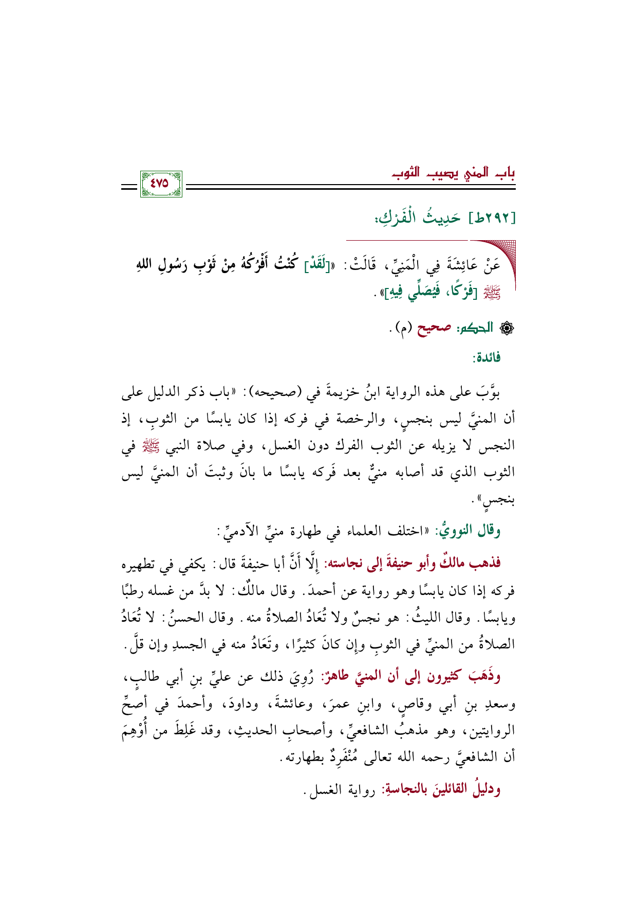 ١ - بوَّبَ على هذه الرواية ابنُ خزيمةَ في (صحيحه): ((باب ذكر الدليل على أن المنيَّ ليس بنجسٍ، والرخصة في فركه إذا كان يابسًا من الثوبِ، إذ النجس لا يزيله عن الثوب الفرك دون الغسل، وفي صلاة النبي صلى الله عليه وسلم في الثوب الذي قد أصابه منيٌّ بعد فَركه يابسًا ما بانَ وثبتَ أن المنيَّ ليس بنجسٍ)).