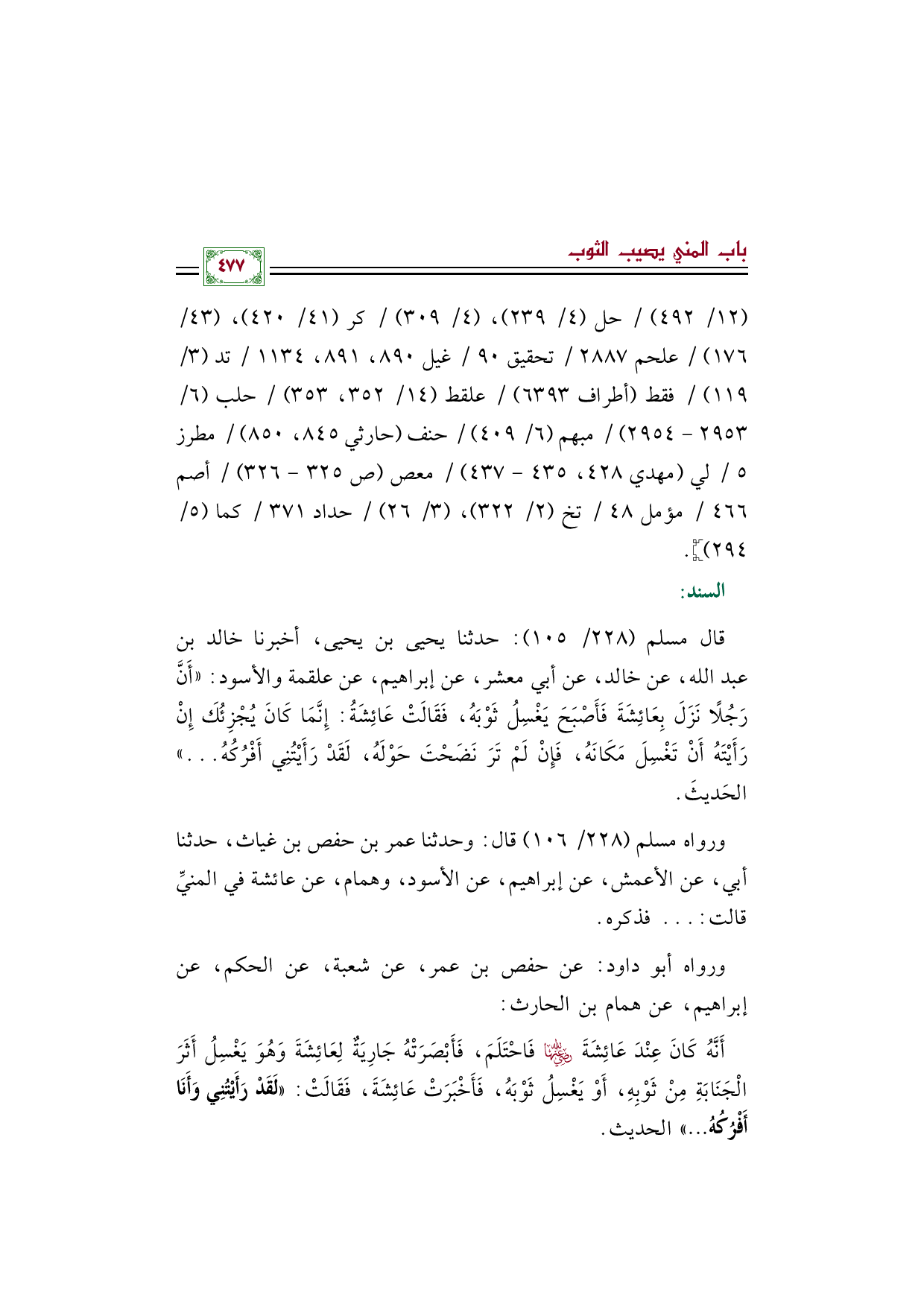 قال مسلم (٢٢٨/ ١٠٥): حدثنا يحيى بن يحيى، أخبرنا خالد بن عبد الله، عن خالد، عن أبي معشر، عن إبراهيم، عن علقمة والأسود: ((أَنَّ رَجُلًا نَزَلَ بِعَائِشَةَ فَأَصْبَحَ يَغْسِلُ ثَوْبَهُ، فَقَالَتْ عَائِشَةُ: إِنَّمَا كَانَ يُجْزِئُكَ إِنْ رَأَيْتَهُ أَنْ تَغْسِلَ مَكَانَهُ، فَإِنْ لَمْ تَرَ نَضَحْتَ حَوْلَهُ، لَقَدْ رَأَيْتُنِي أَفْرُكُهُ ... )) الحَديثَ.