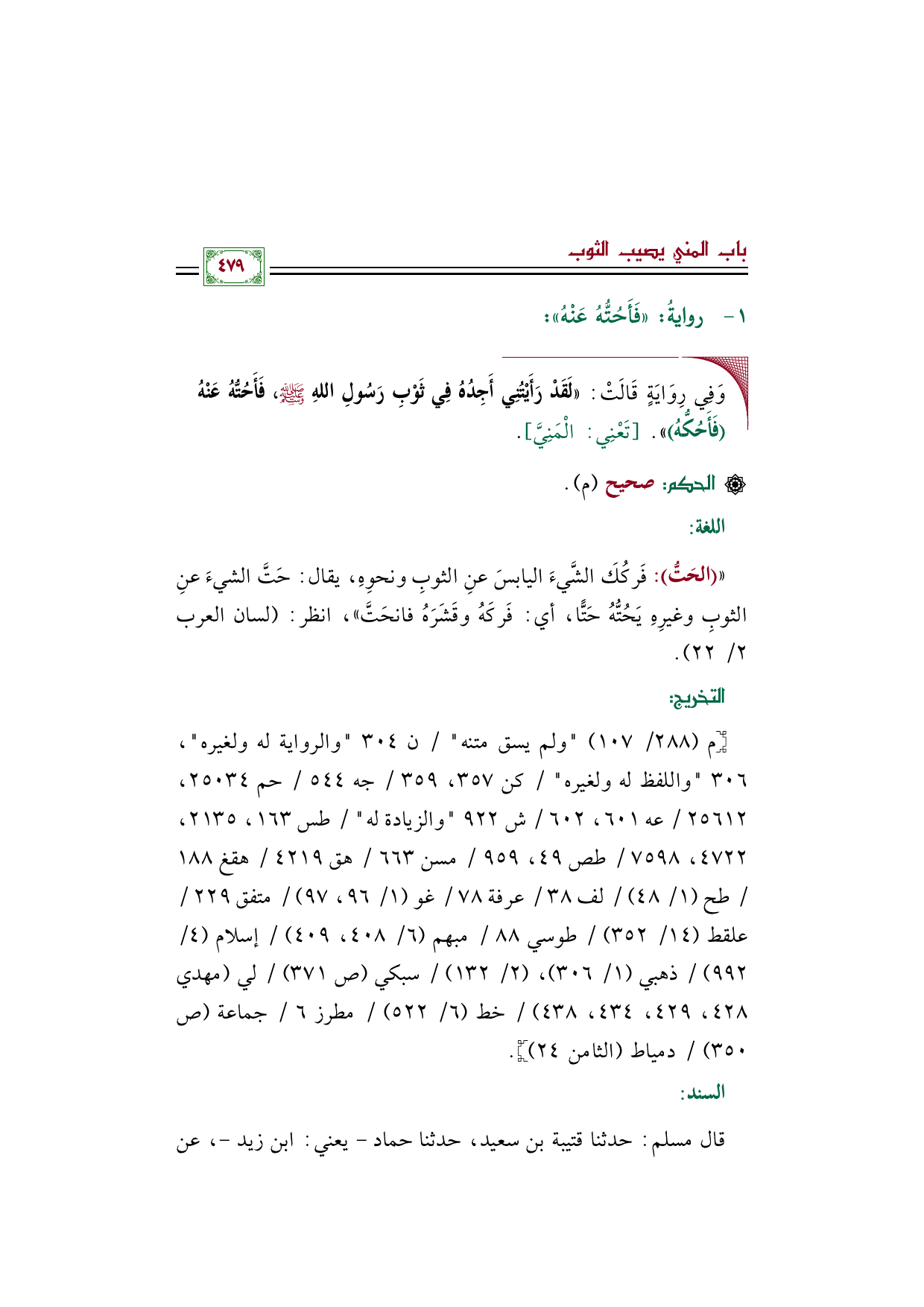 ◼وَفِي رِوَايَةٍ قَالَتْ: ((لَقَدْ رَأَيْتُنِي أَجِدُهُ فِي ثَوْبِ رَسُولِ اللهِ صلى الله عليه وسلم، فَأَحُتُّهُ عَنْهُ (فَأَحُكُّهُ))). [تَعْنِي: الْمَنِيَّ].