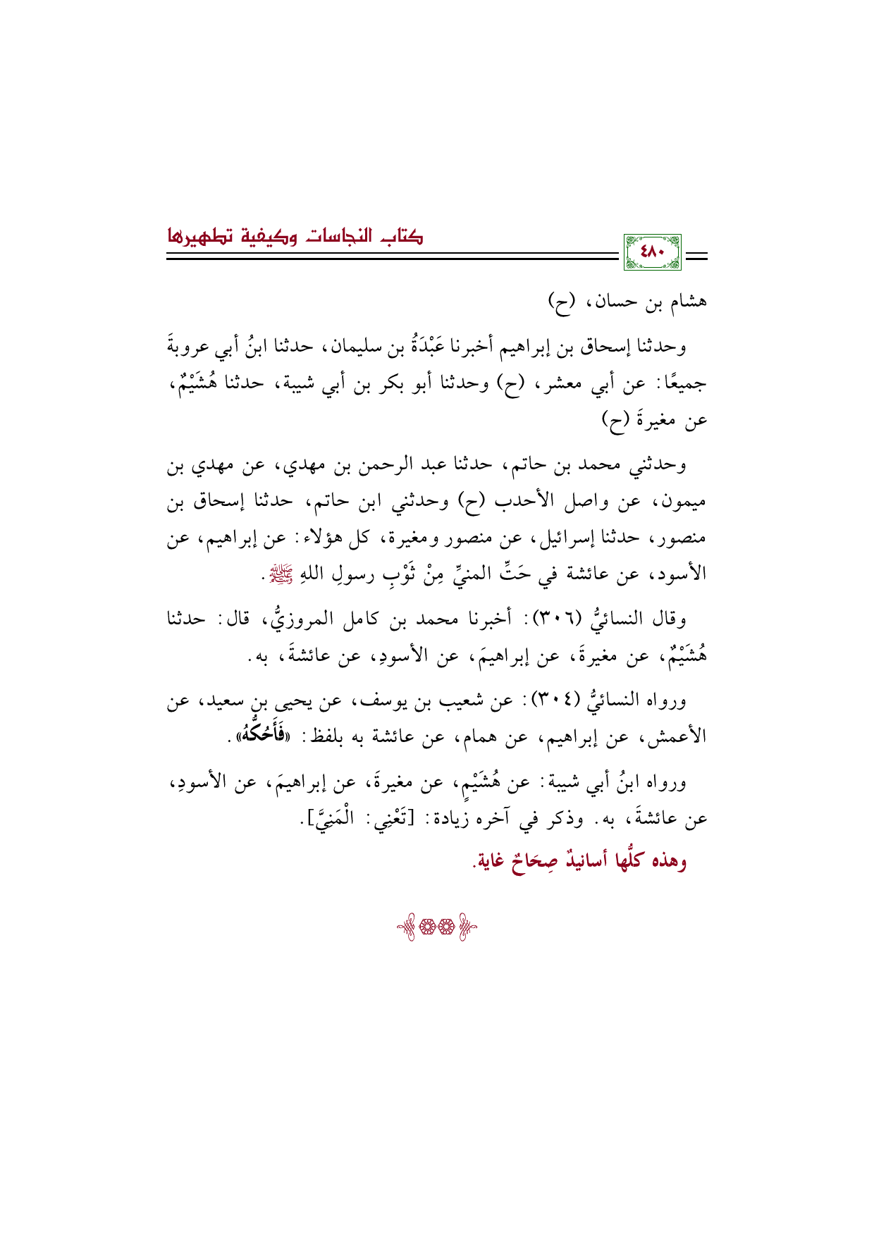 وقال النسائيُّ (٣٠٦): أخبرنا محمد بن كامل المروزيُّ، قال: حدثنا هُشَيْمٌ، عن مغيرةَ، عن إبراهيمَ، عن الأسودِ، عن عائشةَ، به.