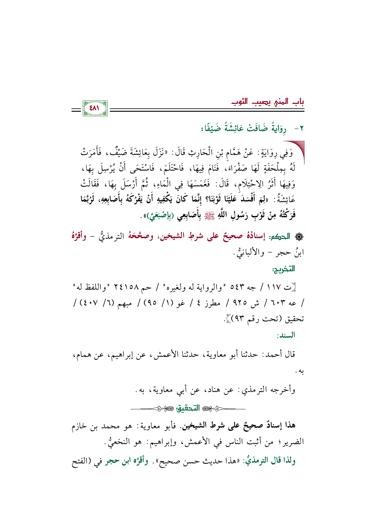 هذا إسنادٌ صحيحٌ على شرط الشيخين. فأبو معاوية: هو محمد بن خازم الضرير؛ من أثبت الناس في الأعمش، وإبراهيم: هو النخعيُّ.