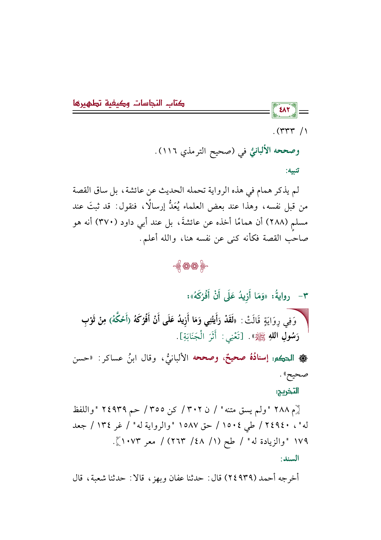 لم يذكر همام في هذه الرواية تحمله الحديث عن عائشة، بل ساق القصة من قبل نفسه، وهذا عند بعض العلماء يُعَدُّ إرسالًا، فنقول: قد ثبتَ عند مسلمٍ (٢٨٨) أن همامًا أخذه عن عائشةَ، بل عند أبي داود (٣٧٠) أنه هو صاحب القصة فكأنه كنى عن نفسه هنا، والله أعلم.