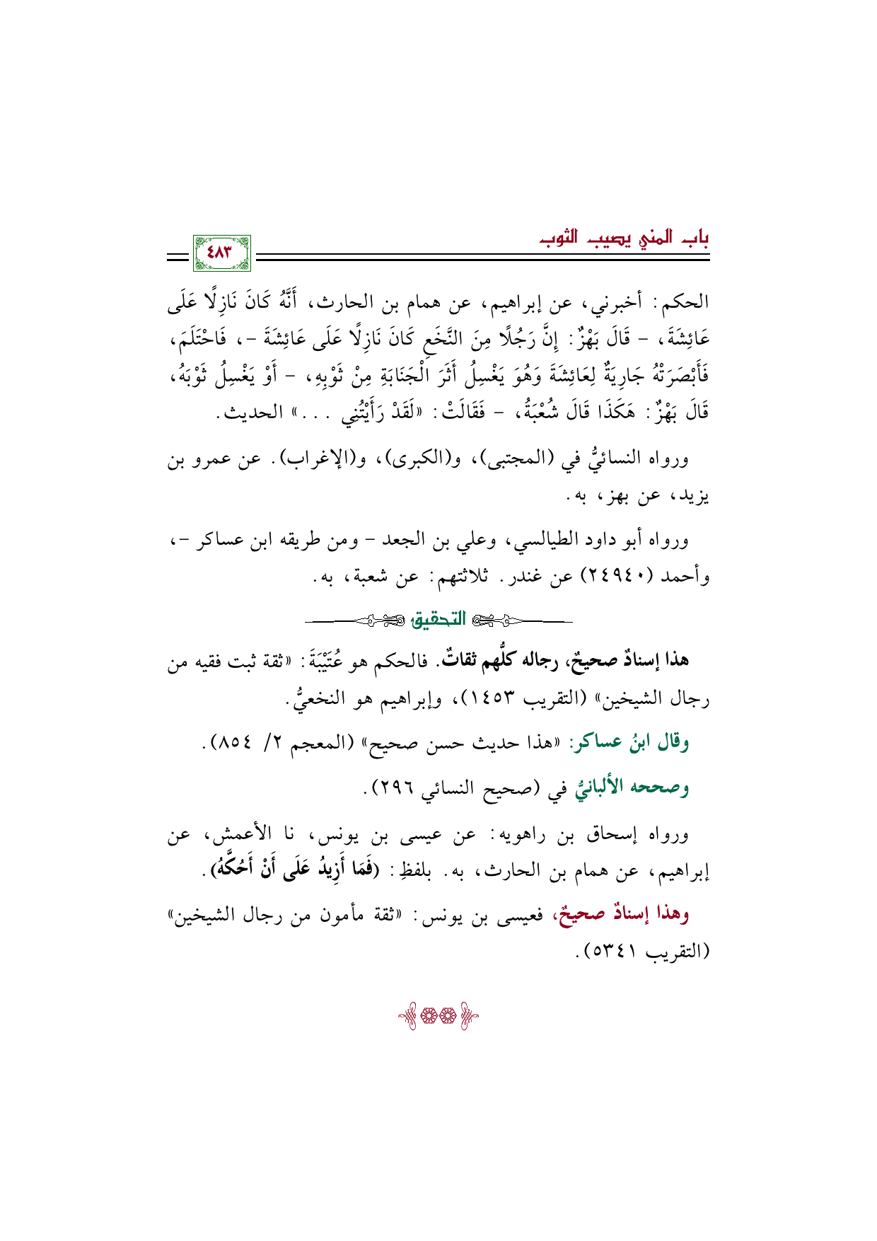 الحكم: أخبرني، عن إبراهيم، عن همام بن الحارث، أَنَّهُ كَانَ نَازِلًا عَلَى عَائِشَةَ، -قَالَ بَهْزٌ: إِنَّ رَجُلًا مِنَ النَّخَعِ كَانَ نَازِلًا عَلَى عَائِشَةَ-، فَاحْتَلَمَ، فَأَبْصَرَتْهُ جَارِيَةٌ لِعَائِشَةَ وَهُوَ يَغْسِلُ أَثَرَ الْجَنَابَةِ مِنْ ثَوْبِهِ، -أَوْ يَغْسِلُ ثَوْبَهُ، قَالَ بَهْزٌ: هَكَذَا قَالَ شُعْبَةُ، - فَقَالَتْ: ((لَقَدْ رَأَيْتُنِي ... )) الحديث.