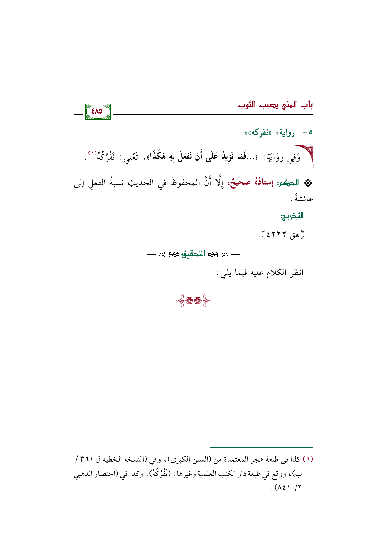 (¬١) كذا في طبعة هجر المعتمدة من (السنن الكبرى)، وفي (النسخة الخطية ق ٣٦١/ ب)، ووقع في طبعة دار الكتب العلمية وغيرها: (تَفْرُكُهُ). وكذا في (اختصار الذهبي ٢/ ٨٤١).