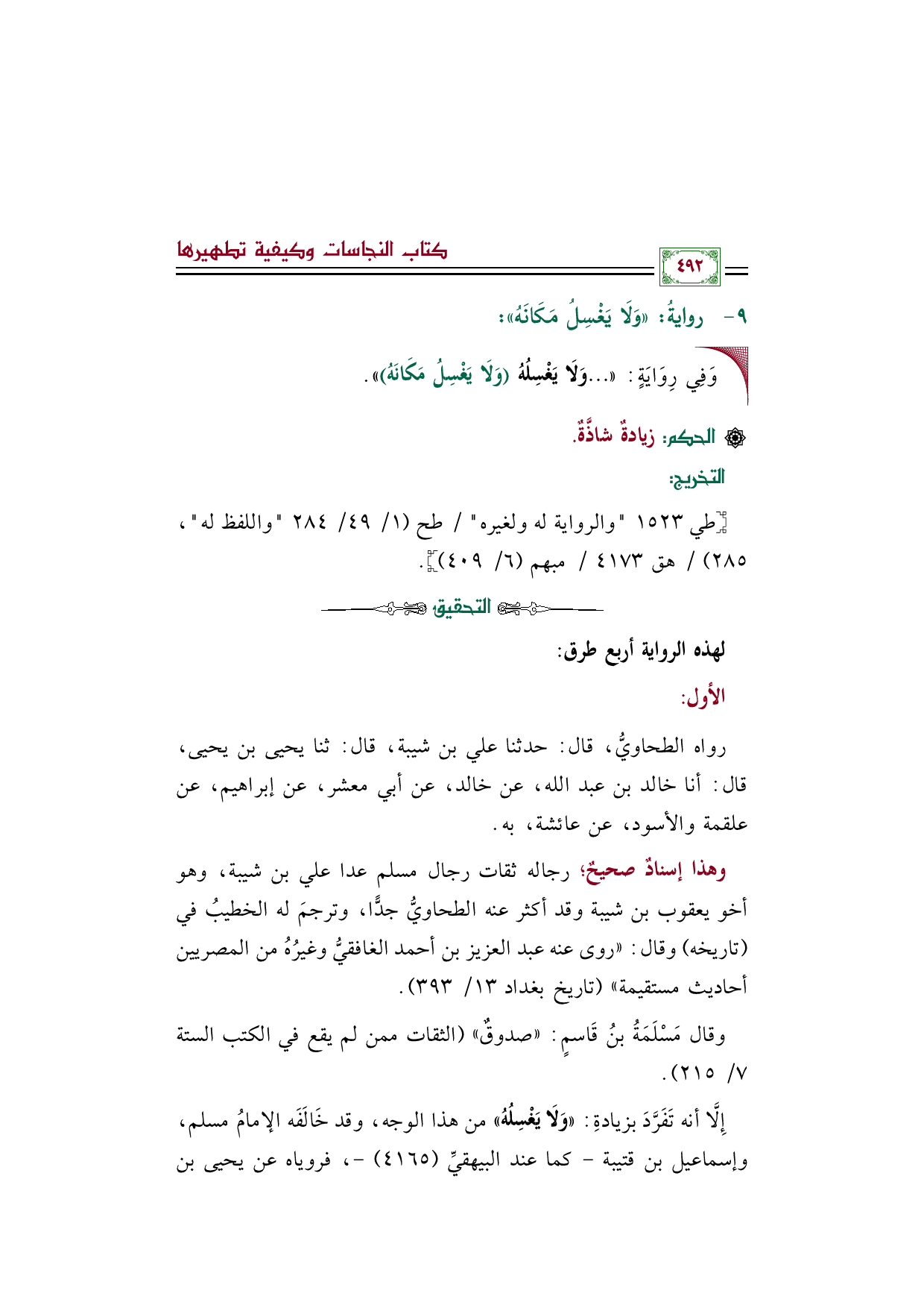إِلَّا أنه تَفَرَّدَ بزيادةِ: ((وَلَا يَغْسِلُهُ)) من هذا الوجه، وقد خَالَفَه الإمامُ مسلم، وإسماعيل بن قتيبة - كما عند البيهقيِّ (٤١٦٥) -، فروياه عن يحيى بن