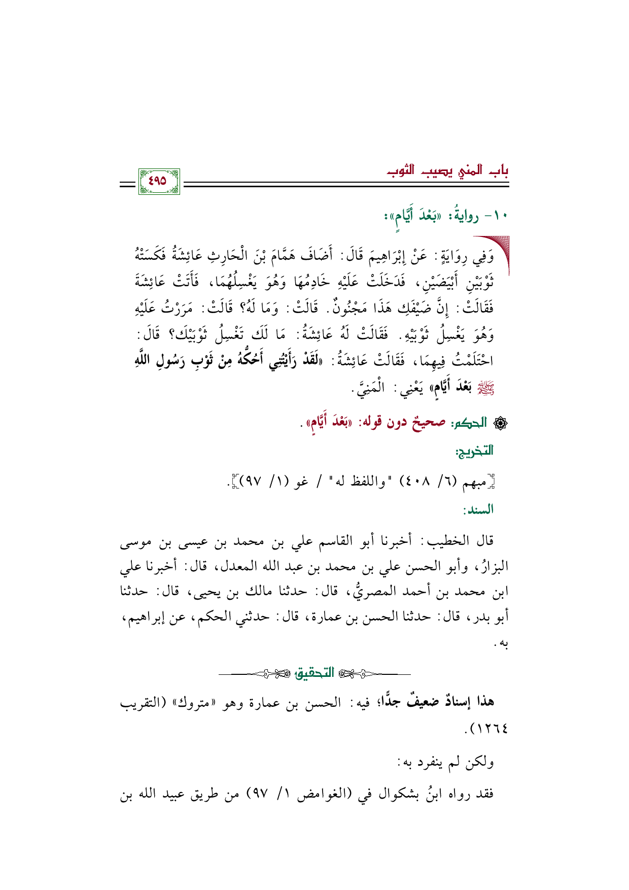 قال الخطيب: أخبرنا أبو القاسم علي بن محمد بن عيسى بن موسى البزارُ، وأبو الحسن علي بن محمد بن عبد الله المعدل، قال: أخبرنا علي بن محمد بن أحمد المصريُّ، قال: حدثنا مالك بن يحيى، قال: حدثنا أبو بدر، قال: حدثنا الحسن بن عمارة، قال: حدثني الحكم، عن إبراهيم، به.