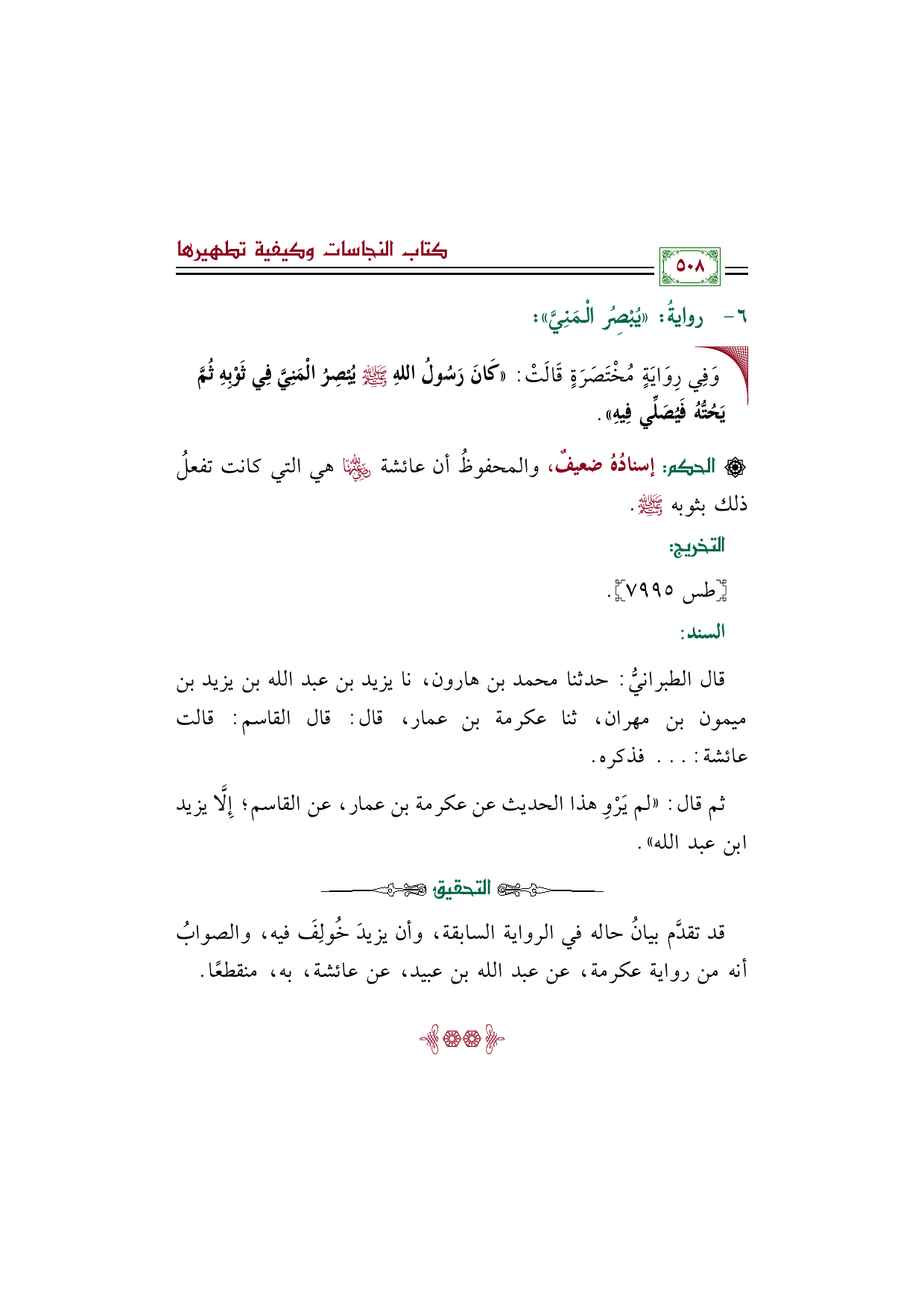• وَفِي رِوَايَةٍ مُخْتَصَرَةٍ قَالَتْ: ((كَانَ رَسُولُ اللهِ صلى الله عليه وسلم يُبْصِرُ الْمَنِيَّ فِي ثَوْبِهِ ثُمَّ يَحُتُّهُ فَيُصَلِّي فِيهِ)).