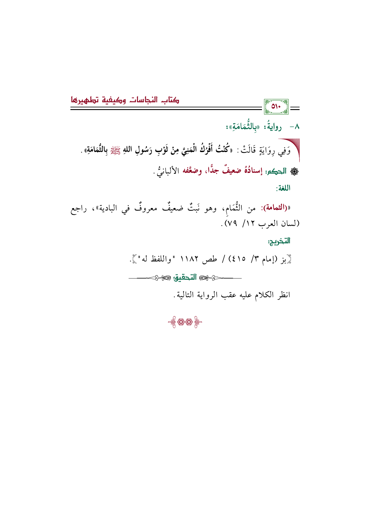 •وَفِي رِوَايَةٍ قَالَتْ: ((كُنْتُ أَفْرُكُ الْمَنِيَّ مِنْ ثَوْبِ رَسُولِ اللهِ صلى الله عليه وسلم بِالثُّمَامَةِ)).