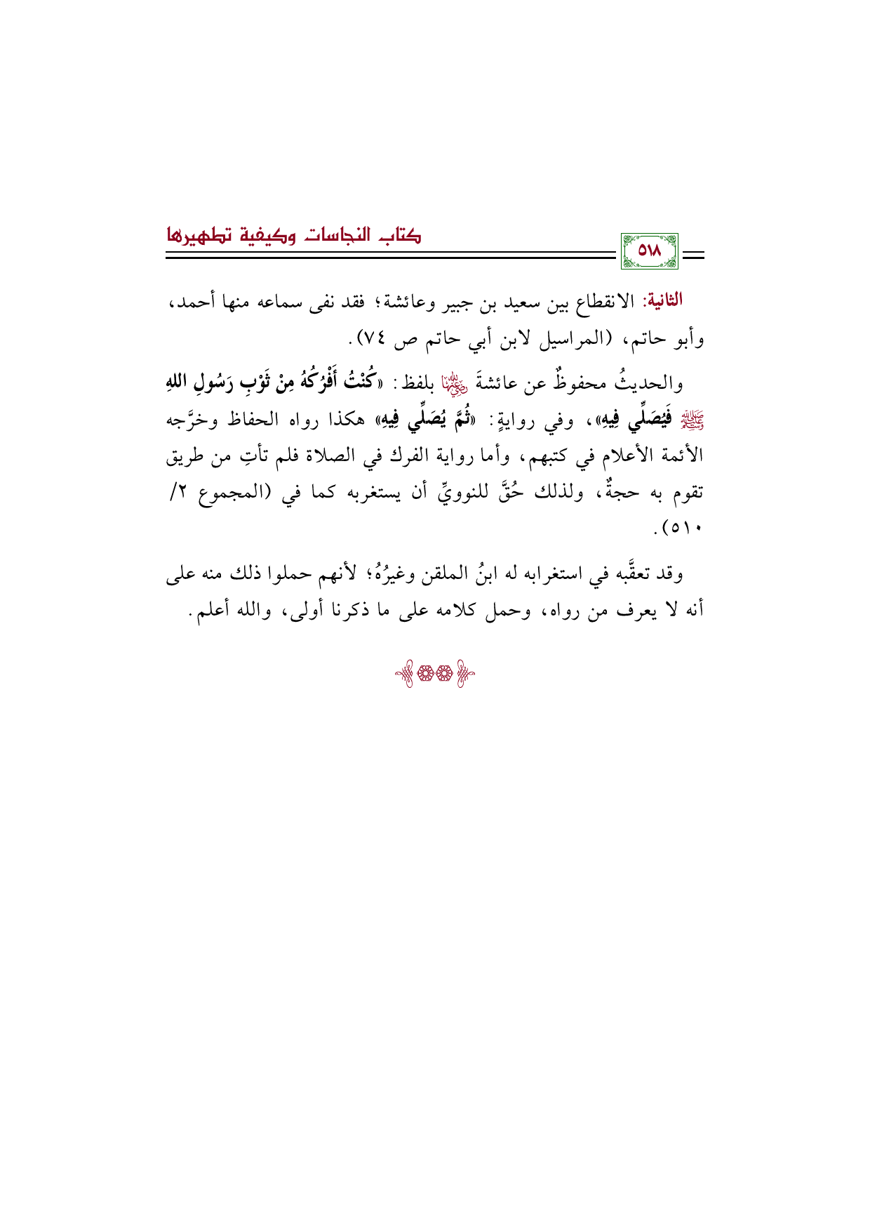 والحديثُ محفوظٌ عن عائشةَ رضي الله عنها بلفظ: ((كُنْتُ أَفْرُكُهُ مِنْ ثَوْبِ رَسُولِ اللهِ صلى الله عليه وسلم فَيُصَلِّي فِيهِ))، وفي روايةٍ: ((ثُمَّ يُصَلِّي فِيهِ)) هكذا رواه الحفاظ وخرَّجه الأئمة الأعلام في كتبهم، وأما رواية الفرك في الصلاة فلم تأتِ من طريق تقوم به حجةٌ، ولذلك حُقَّ للنوويِّ أن يستغربه كما في (المجموع ٢/ ٥١٠).