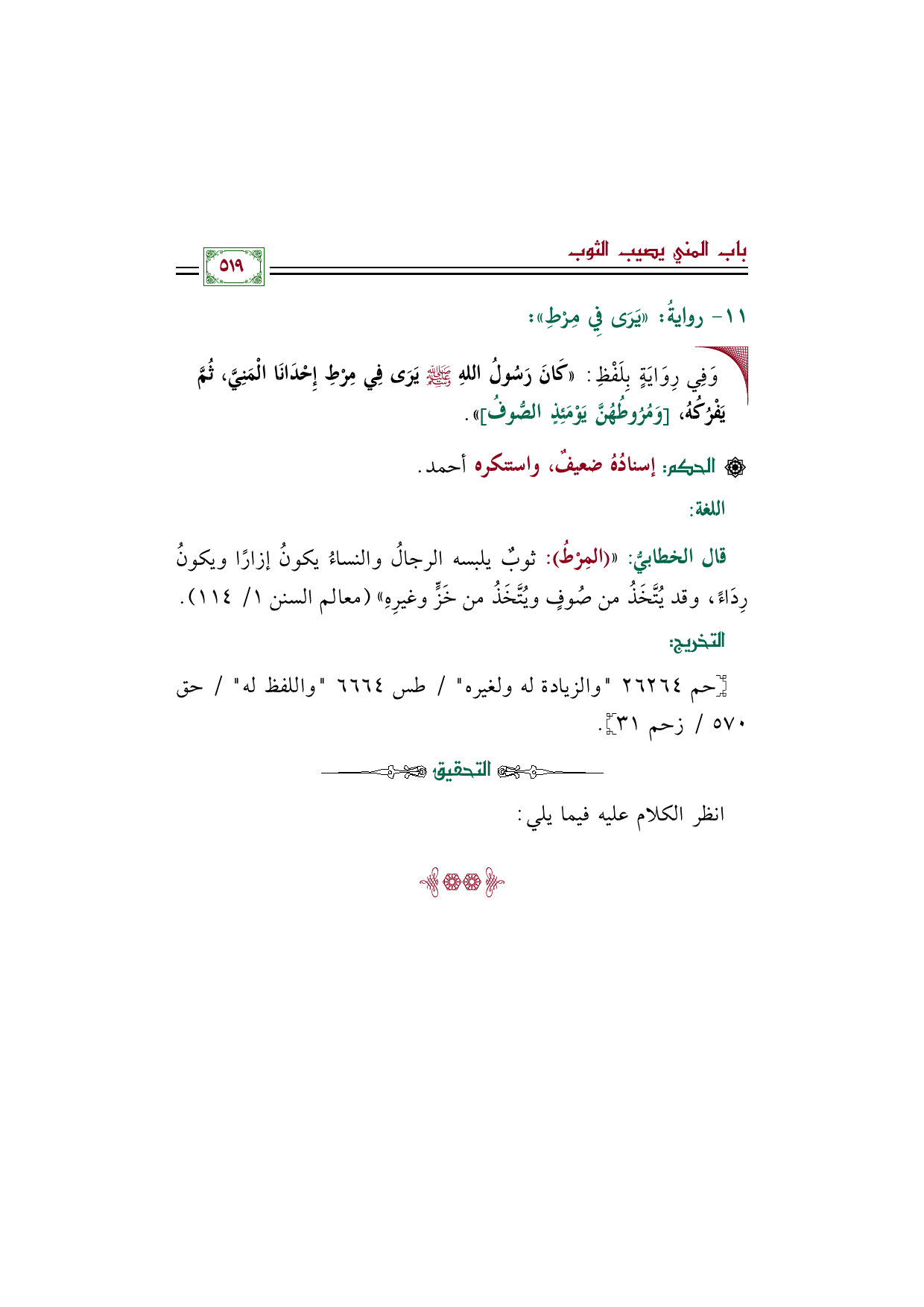 • وَفِي رِوَايَةٍ بِلَفْظِ: ((كَانَ رَسُولُ اللهِ صلى الله عليه وسلم يَرَى فِي مِرْطِ إِحْدَانَا الْمَنِيَّ، ثُمَّ يَفْرُكُهُ، [وَمُرُوطُهُنَّ يَوْمَئِذٍ الصُّوفُ])).
