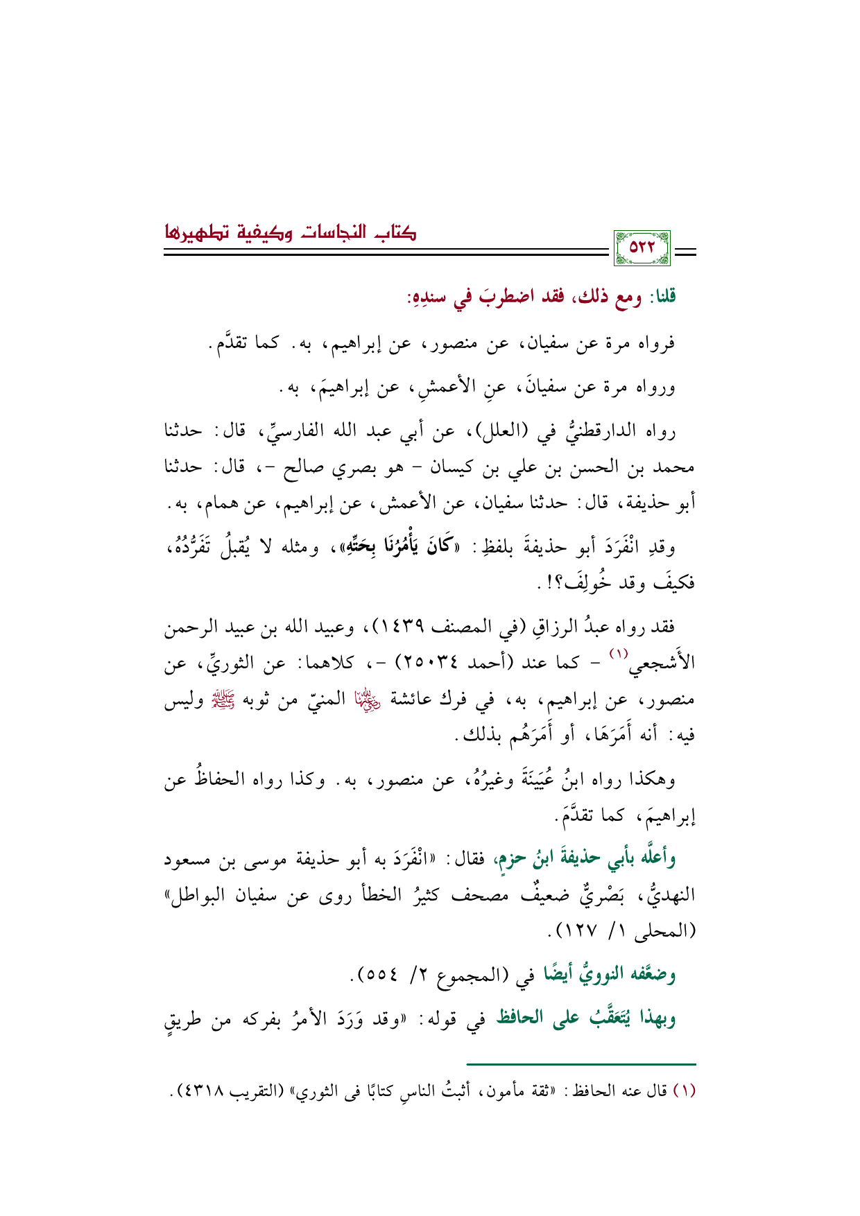 وأعلَّه بأبي حذيفةَ ابنُ حزمٍ، فقال: ((انْفَرَدَ به أبو حذيفة موسى بن مسعود النهديُّ، بَصْريٌّ ضعيفٌ مصحف كثيرُ الخطأ روى عن سفيان البواطل)) (المحلى ١/ ١٢٧).