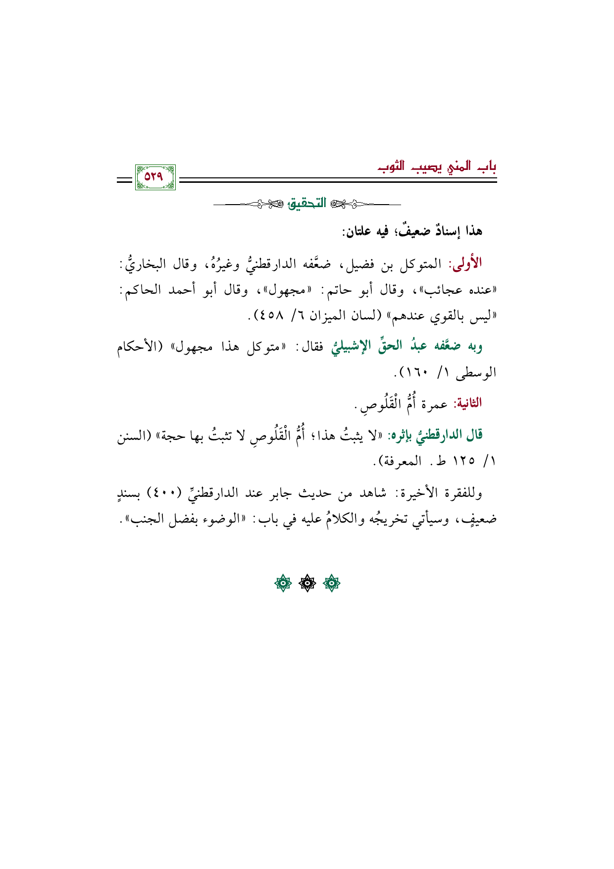 وبه ضعَّفه عبدُ الحقِّ الإشبيليُّ فقال: ((متوكل هذا مجهول)) (الأحكام الوسطى ١/ ١٦٠).