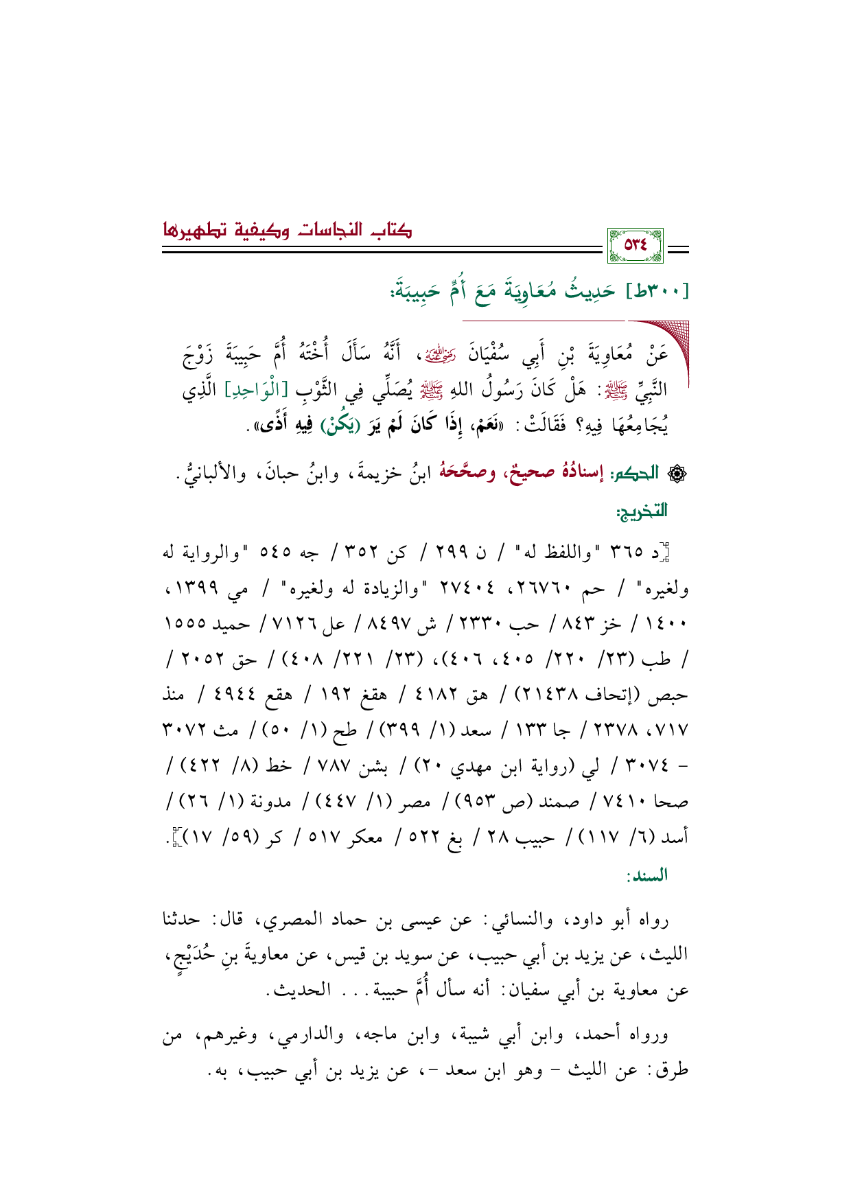 رواه أبو داود، والنسائي: عن عيسى بن حماد المصري، قال: حدثنا الليث، عن يزيد بن أبي حبيب، عن سويد بن قيس، عن معاويةَ بنِ حُدَيْجٍ، عن معاوية بن أبي سفيان: أنه سأل أُمَّ حبيبة ... الحديث.