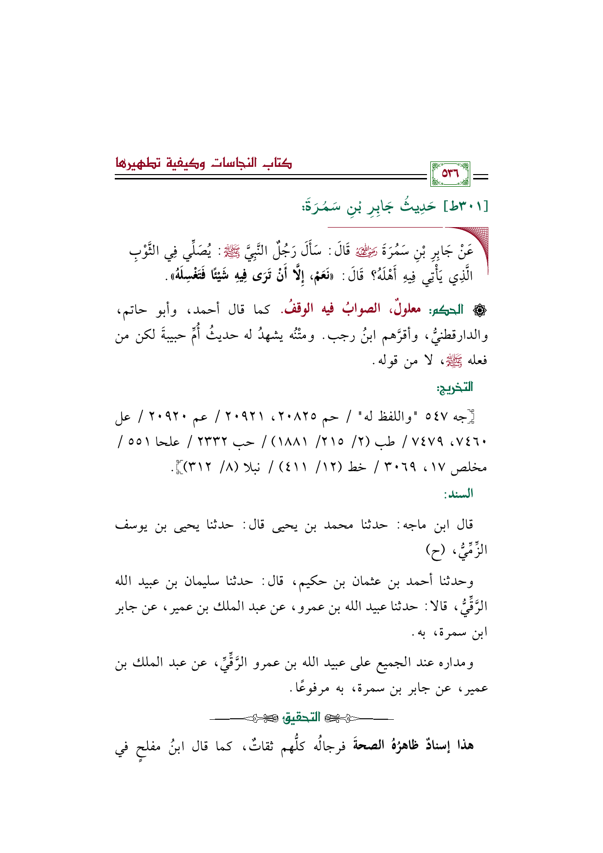 ◼ عَنْ جَابِرِ بْنِ سَمُرَةَ رضي الله عنه قَالَ: سَأَلَ رَجُلٌ النَّبِىَّ صلى الله عليه وسلم: يُصَلِّى فِى الثَّوْبِ الَّذِى يَأْتِى فِيهِ أَهْلَهُ؟ قَالَ: ((نَعَمْ، إِلَّا أَنْ تَرَى فِيهِ شَيْئًا فَتَغْسِلَهُ)).