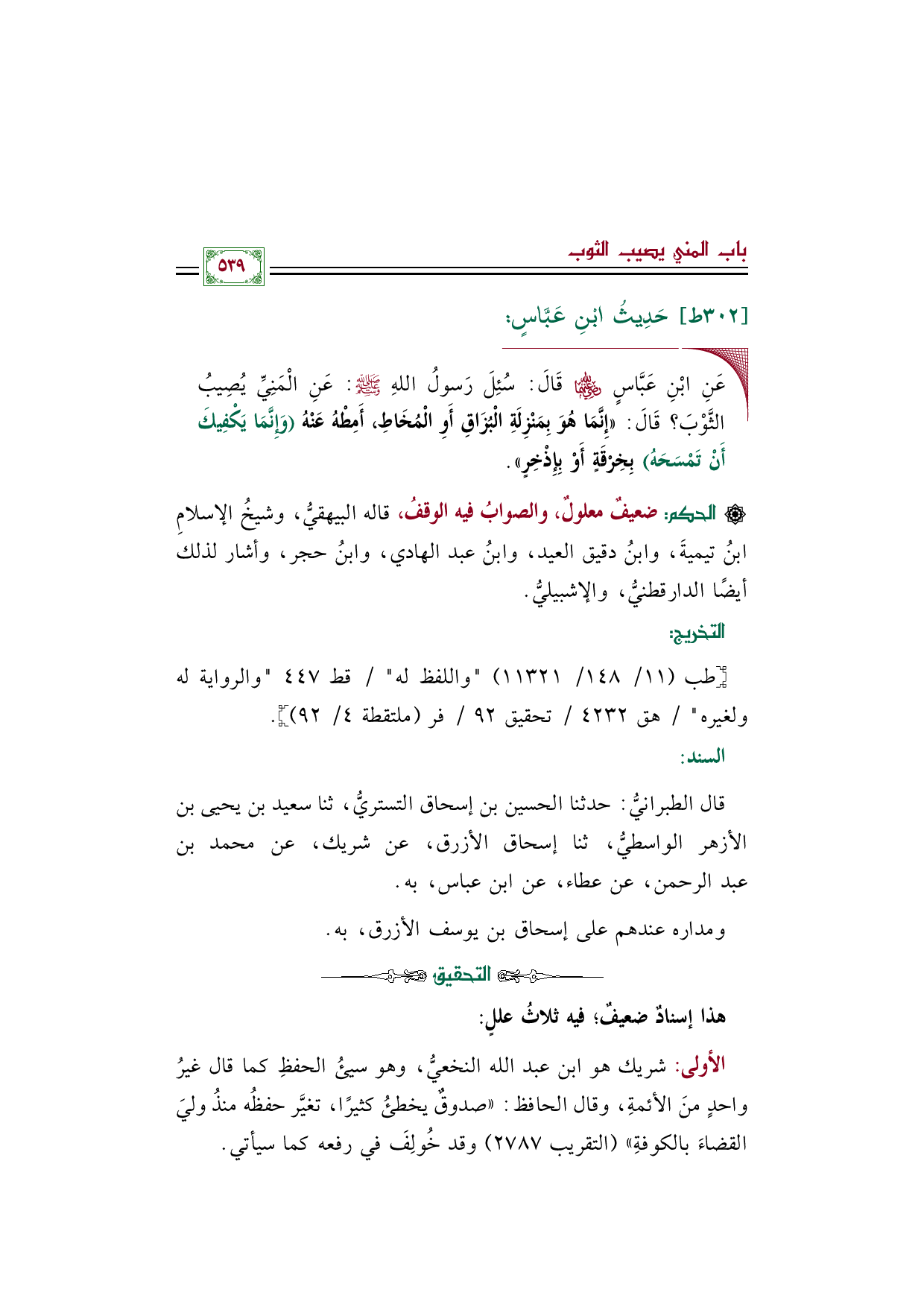 قال الطبرانيُّ: حدثنا الحسين بن إسحاق التستريُّ، ثنا سعيد بن يحيى بن الأزهر الواسطيُّ، ثنا إسحاق الأزرق، عن شريك، عن محمد بن عبد الرحمن، عن عطاء، عن ابن عباس، به.