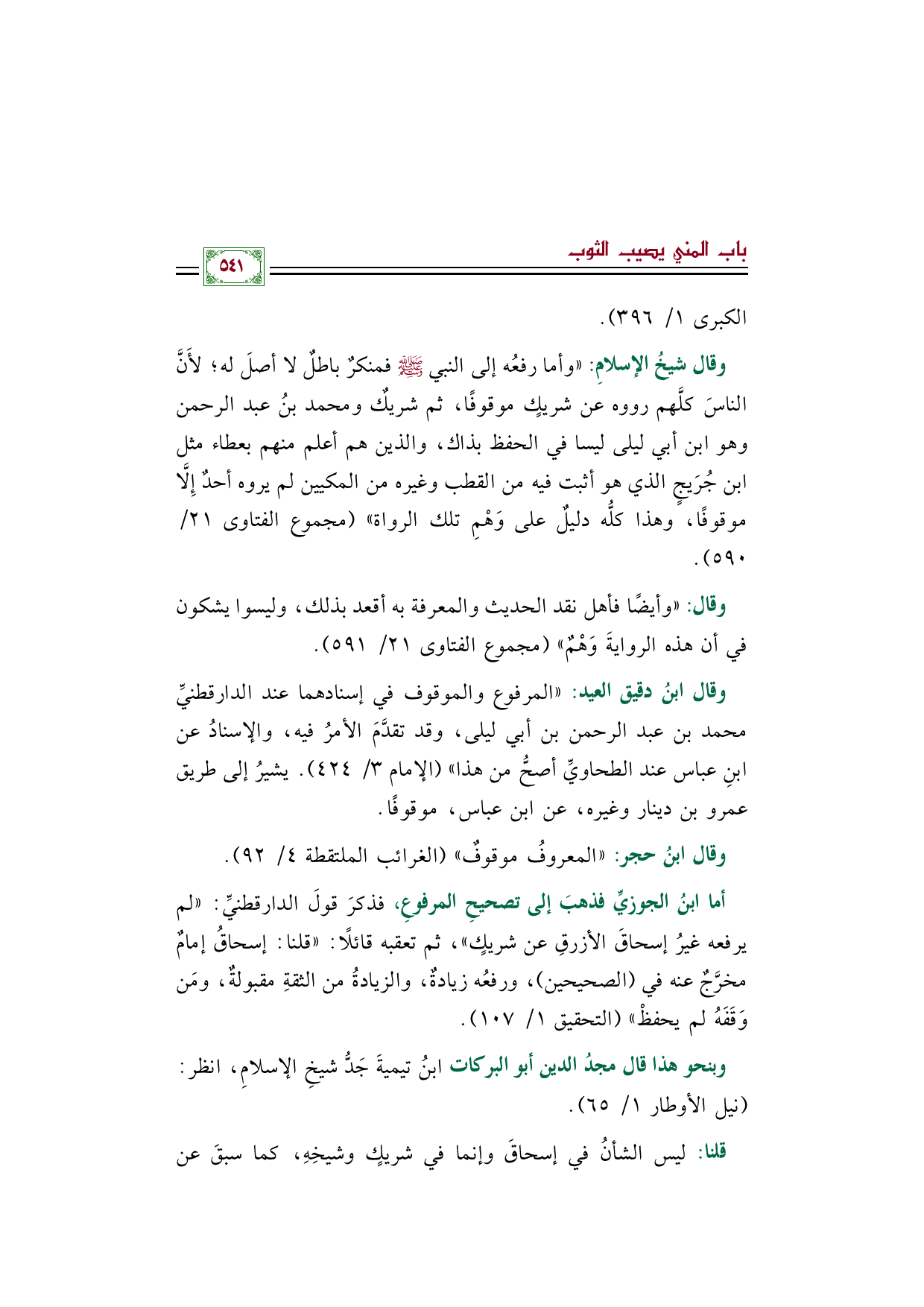 وقال شيخُ الإسلامِ: ((وأما رفعُه إلى النبي صلى الله عليه وسلم فمنكرٌ باطلٌ لا أصلَ له؛ لأَنَّ الناسَ كلَّهم رووه عن شريكٍ موقوفًا، ثم شريكٌ ومحمد بنُ عبد الرحمن وهو ابن أبي ليلى ليسا في الحفظ بذاك، والذين هم أعلم منهم بعطاء مثل ابن جُرَيجٍ الذي هو أثبت فيه من القطب وغيره من المكيين لم يروه أحدٌ إِلَّا موقوفًا، وهذا كلُّه دليلٌ على وَهْمِ تلك الرواة)) (مجموع الفتاوى ٢١/ ٥٩٠).