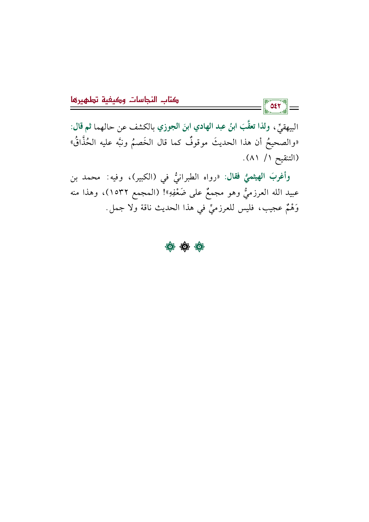 البيهقيِّ، ولذا تعقَّبَ ابنُ عبد الهادي ابنَ الجوزي بالكشف عن حالهما ثم قال: ((والصحيحُ أن هذا الحديثَ موقوفٌ كما قال الخَصمُ ونبَّه عليه الحُذَّاقُ)) (التنقيح ١/ ٨١).
