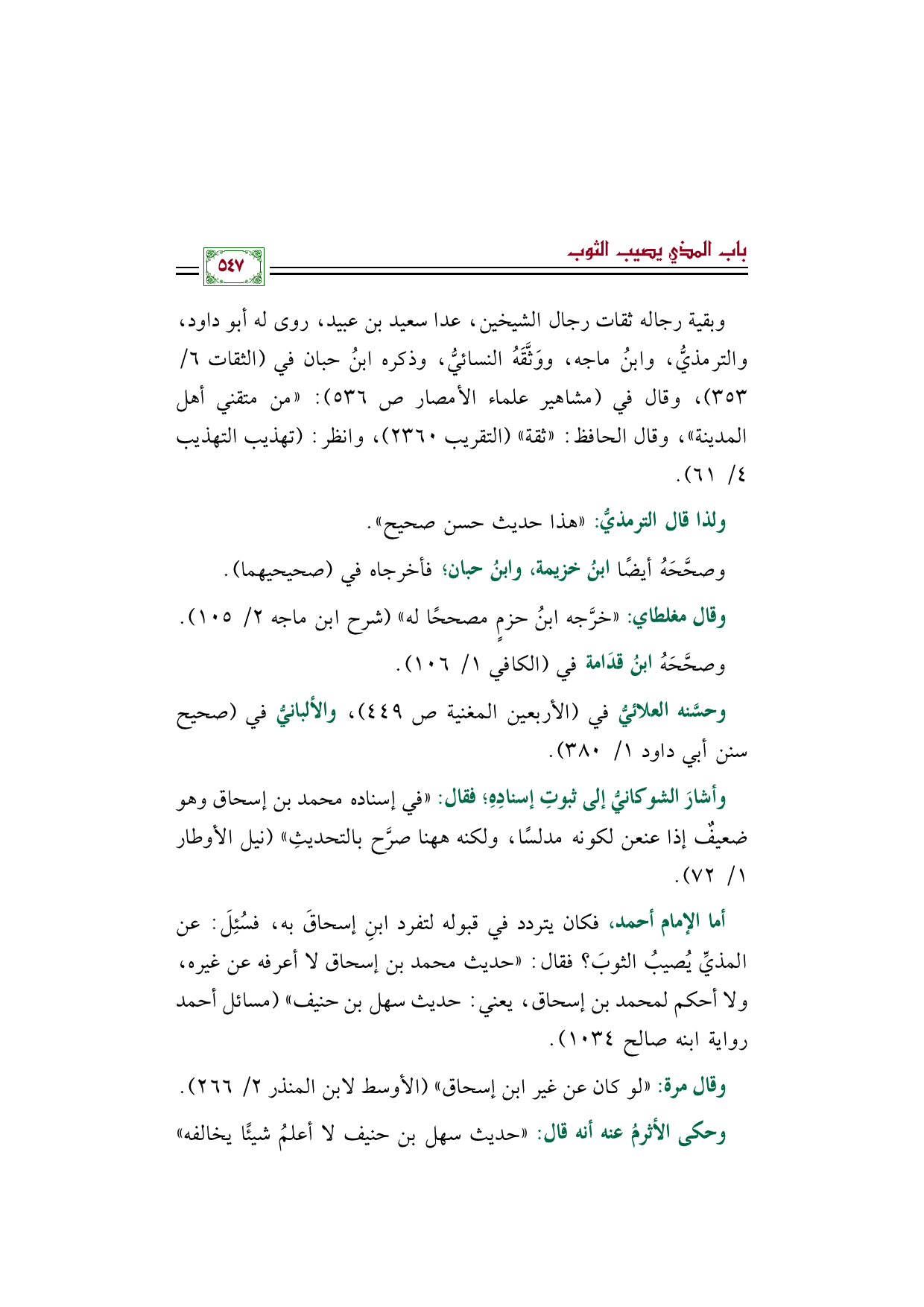 * أما الإمام أحمد، فكان يتردد في قبوله لتفرد ابنِ إسحاقَ به، فسُئِلَ: عن المذيِّ يُصيبُ الثوبَ؟ فقال: ((حديث محمد بن إسحاق لا أعرفه عن غيره، ولا أحكم لمحمد بن إسحاق، يعني: حديث سهل بن حنيف)) (مسائل أحمد رواية ابنه صالح ١٠٣٤).