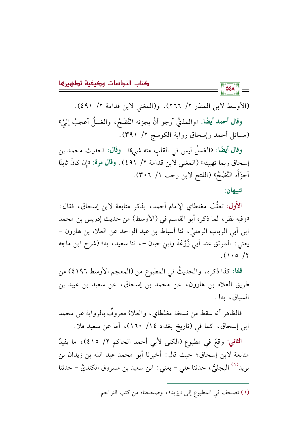 وقال أيضًا: ((الغسلُ ليس في القلبِ منه شيءٌ)). وقال: ((حديث محمد بن إسحاق ربما تهيبته)) (المغني لابن قدامة ٢/ ٤٩١). وقال مرة: ((إِن كانَ ثابتًا أجزَأَه النَّضْحُ)) (الفتح لابن رجب ١/ ٣٠٦).