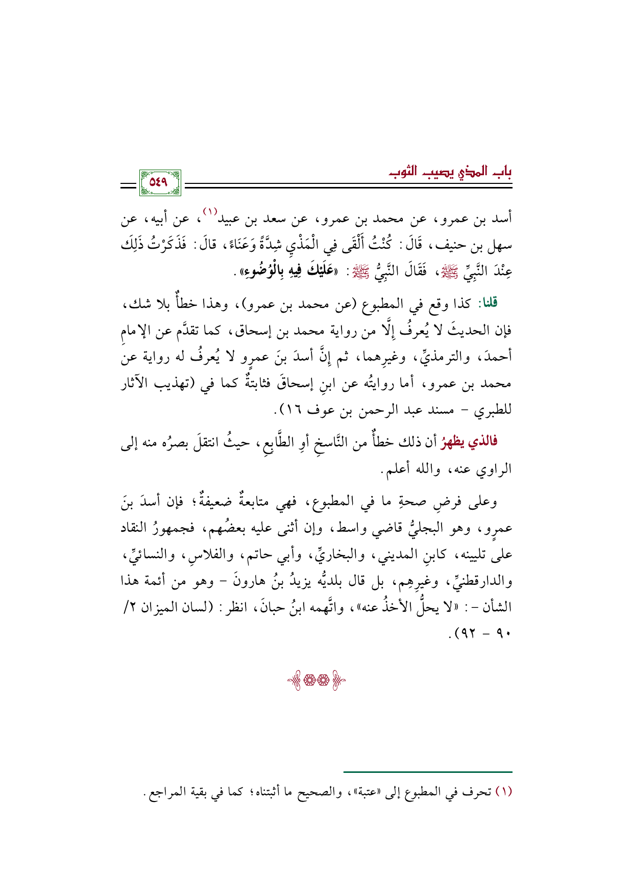 قلنا: كذا وقع في المطبوع (عن محمد بن عمرو)، وهذا خطأٌ بلا شك، فإن الحديثَ لا يُعرفُ إِلَّا من رواية محمد بن إسحاق، كما تقدَّم عن الإمامِ أحمدَ، والترمذيِّ، وغيرِهما، ثم إِنَّ أسدَ بنَ عمرٍو لا يُعرفُ له رواية عن محمد بن عمرو، أما روايتُه عن ابنِ إسحاقَ فثابتةٌ كما في (تهذيب الآثار للطبري - مسند عبد الرحمن بن عوف ١٦).