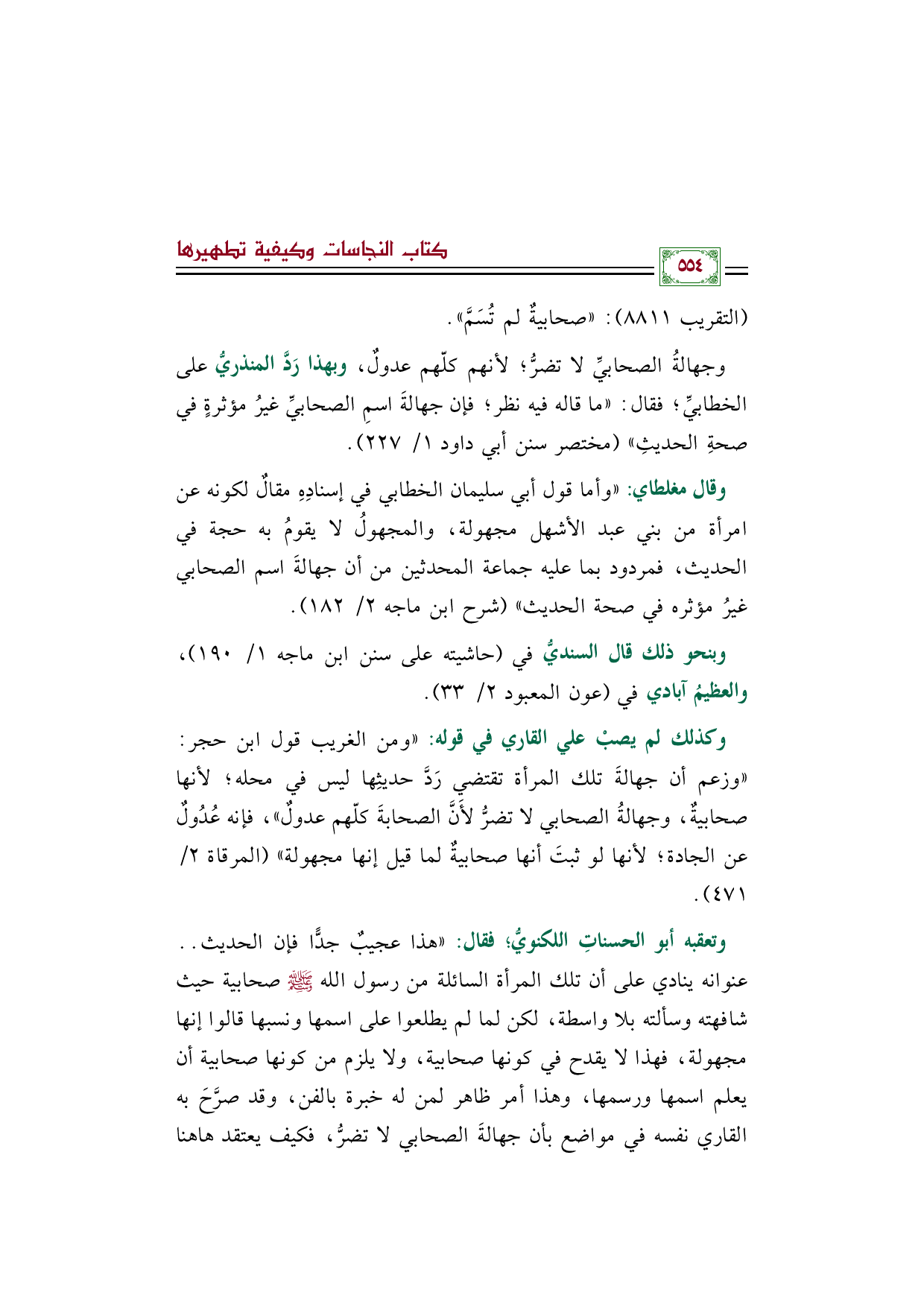 وجهالةُ الصحابيِّ لا تضرُّ؛ لأنهم كلّهم عدولٌ، وبهذا رَدَّ المنذريُّ على الخطابيِّ؛ فقال: ((ما قاله فيه نظر؛ فإن جهالةَ اسمِ الصحابيِّ غيرُ مؤثرةٍ في صحةِ الحديثِ)) (مختصر سنن أبي داود ١/ ٢٢٧).