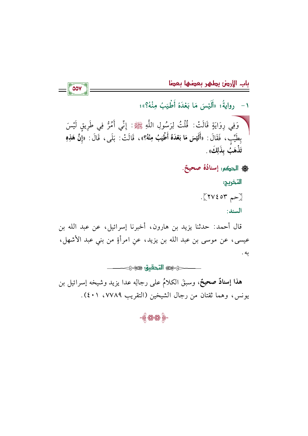 • وَفِي رِوَايَةٍ قَالَتْ: قُلْتُ لِرَسُولِ اللَّهِ صلى الله عليه وسلم: إِنِّي أَمُرُّ فِي طَرِيقٍ لَيْسَ بِطَيِّبٍ، فَقَالَ: ((أَلَيْسَ مَا بَعْدَهُ أَطْيَبُ مِنْهُ؟))، قَالَتْ: بَلَى، قَالَ: ((إِنَّ هَذِهِ تَذْهَبُ بِذَلِكَ)).