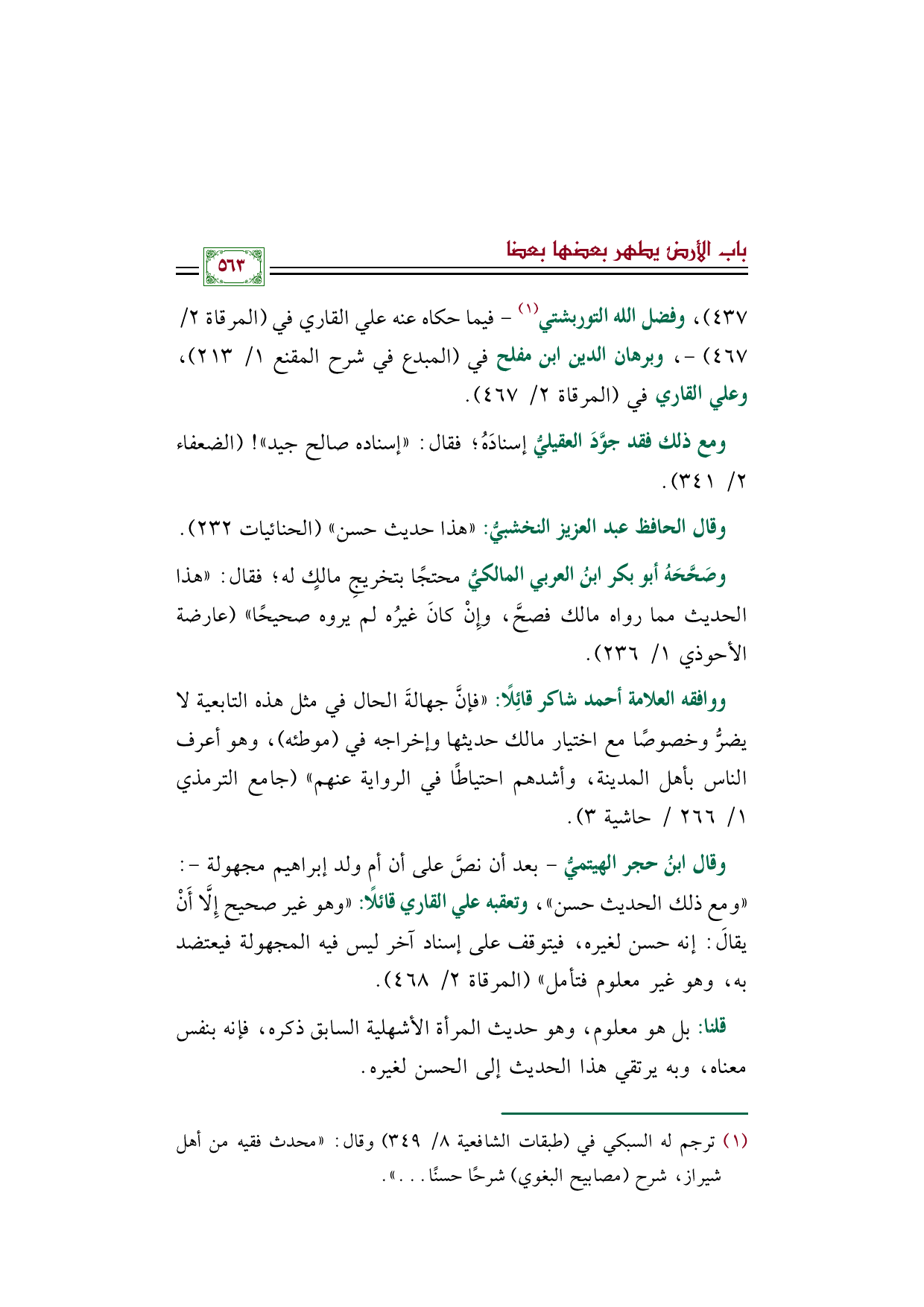 وقال ابنُ حجر الهيتميُّ -بعد أن نصَّ على أن أم ولد إبراهيم مجهولة-: ((ومع ذلك الحديث حسن))، وتعقبه علي القاري قائلًا: ((وهو غير صحيح إِلَّا أَنْ يقالَ: إنه حسن لغيره، فيتوقف على إسناد آخر ليس فيه المجهولة فيعتضد به، وهو غير معلوم فتأمل)) (المرقاة ٢/ ٤٦٨).