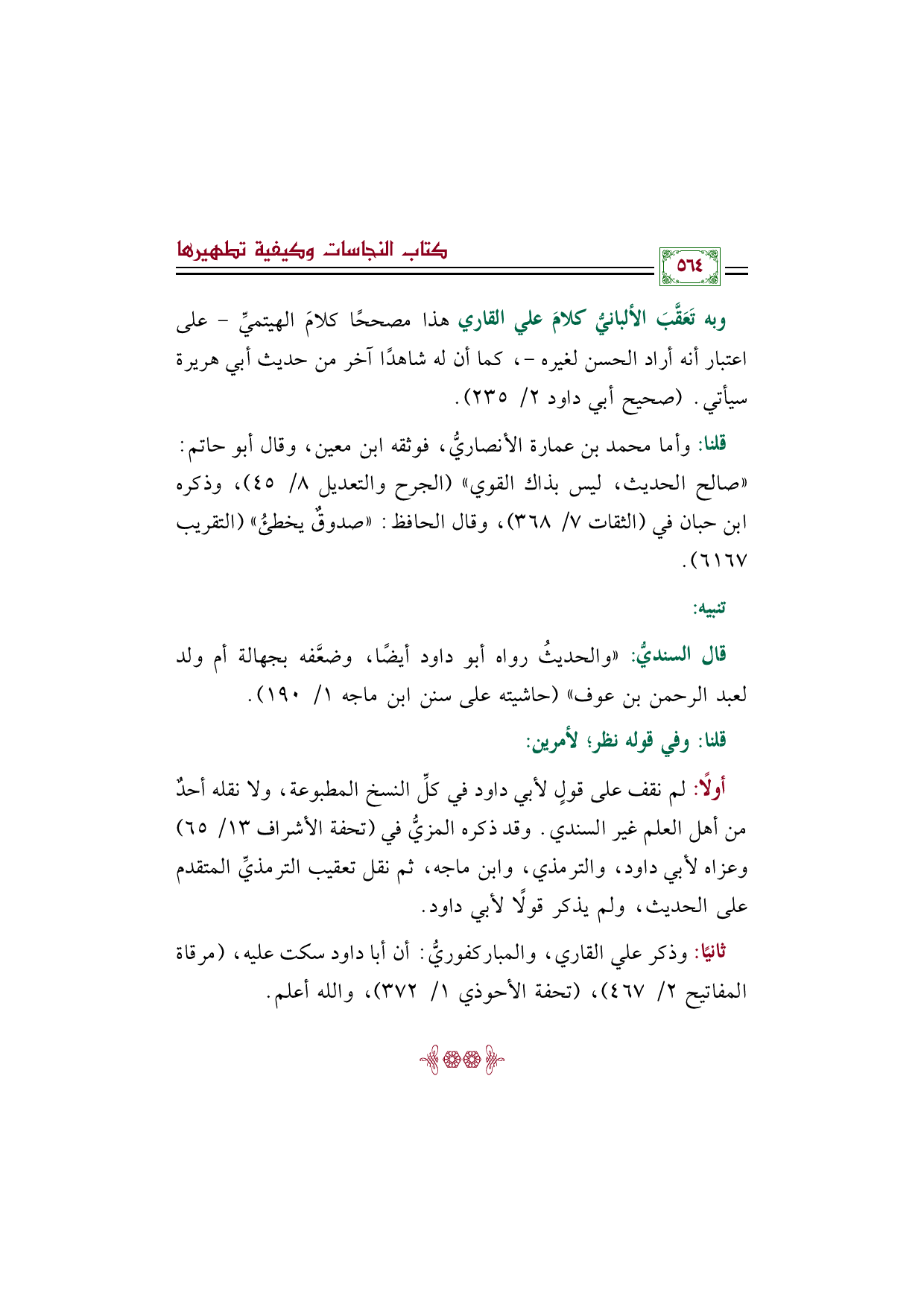 ثانيًا: وذكر علي القاري، والمباركفوريُّ: أن أبا داود سكت عليه، (مرقاة المفاتيح ٢/ ٤٦٧)، (تحفة الأحوذي ١/ ٣٧٢)، والله أعلم.