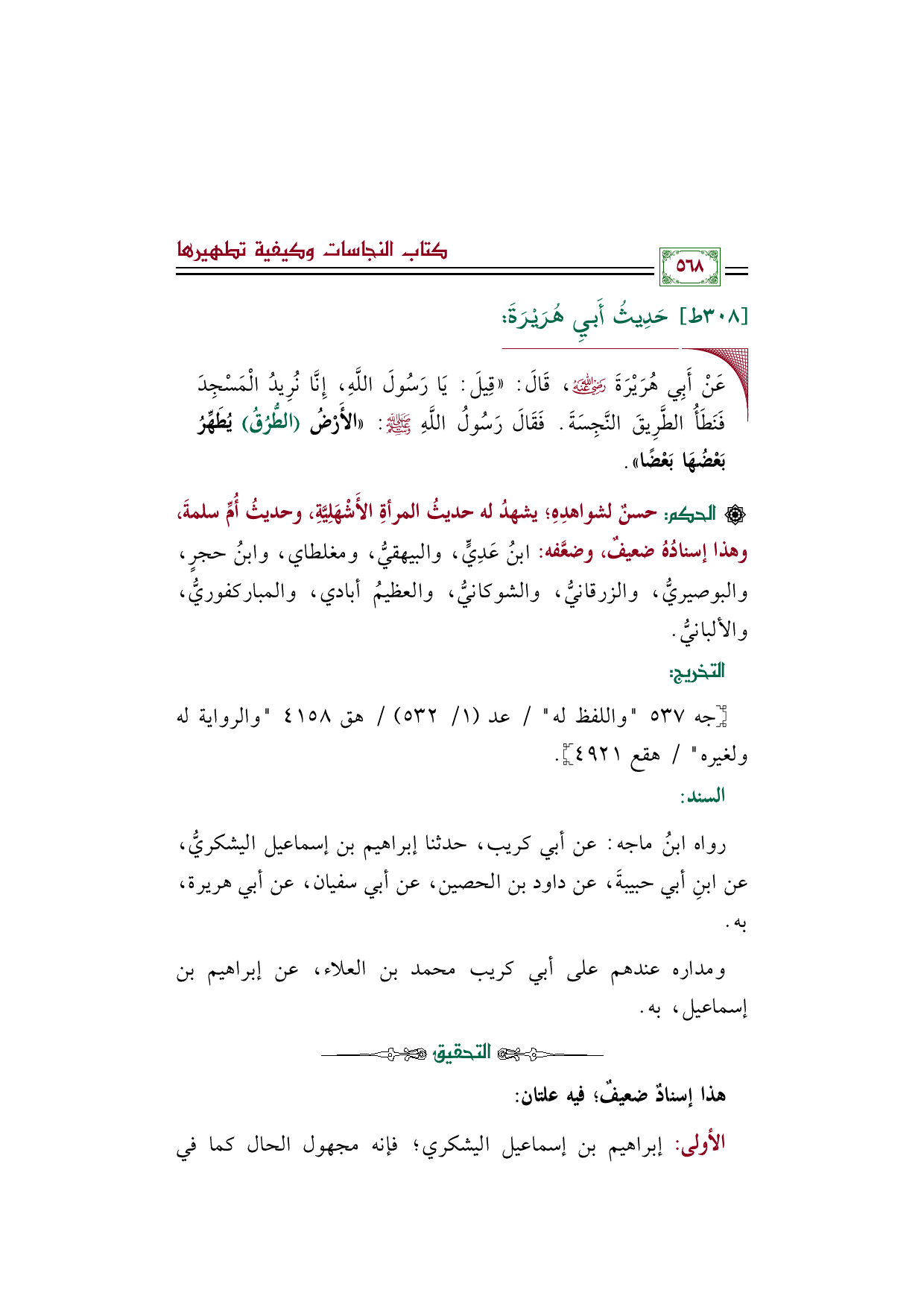 رواه ابنُ ماجه: عن أبي كريب، حدثنا إبراهيم بن إسماعيل اليشكريُّ، عن ابنِ أبي حبيبةَ، عن داود بن الحصين، عن أبي سفيان، عن أبي هريرة، به.