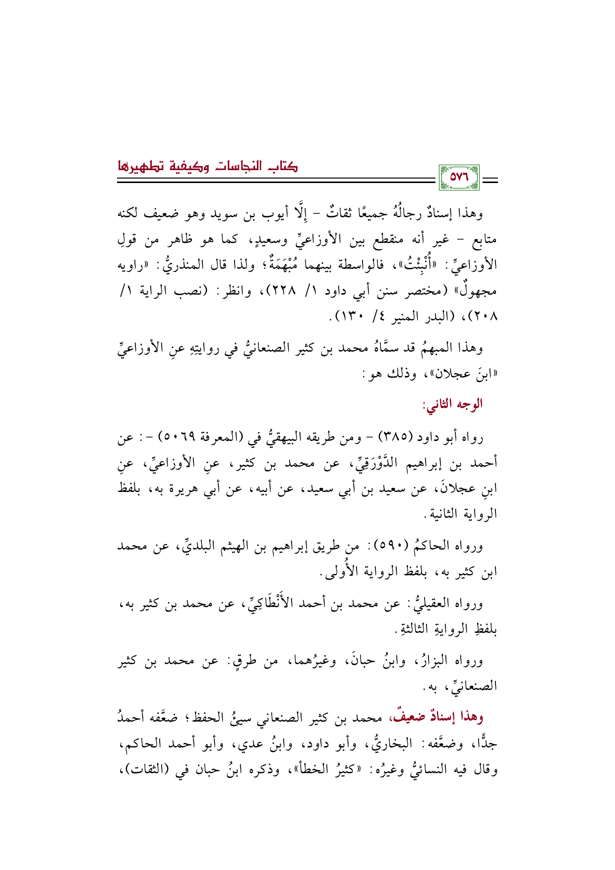 وهذا إسنادٌ رجالُهُ جميعًا ثقاتٌ -إِلَّا أيوب بن سويد وهو ضعيف لكنه متابع- غير أنه منقطع بين الأوزاعيِّ وسعيدٍ، كما هو ظاهر من قولِ الأوزاعيِّ: ((أُنْبِئْتُ))، فالواسطة بينهما مُبْهَمَةٌ؛ ولذا قال المنذريُّ: ((راويه مجهولٌ)) (مختصر سنن أبي داود ١/ ٢٢٨)، وانظر: (نصب الراية ١/ ٢٠٨)، (البدر المنير ٤/ ١٣٠).