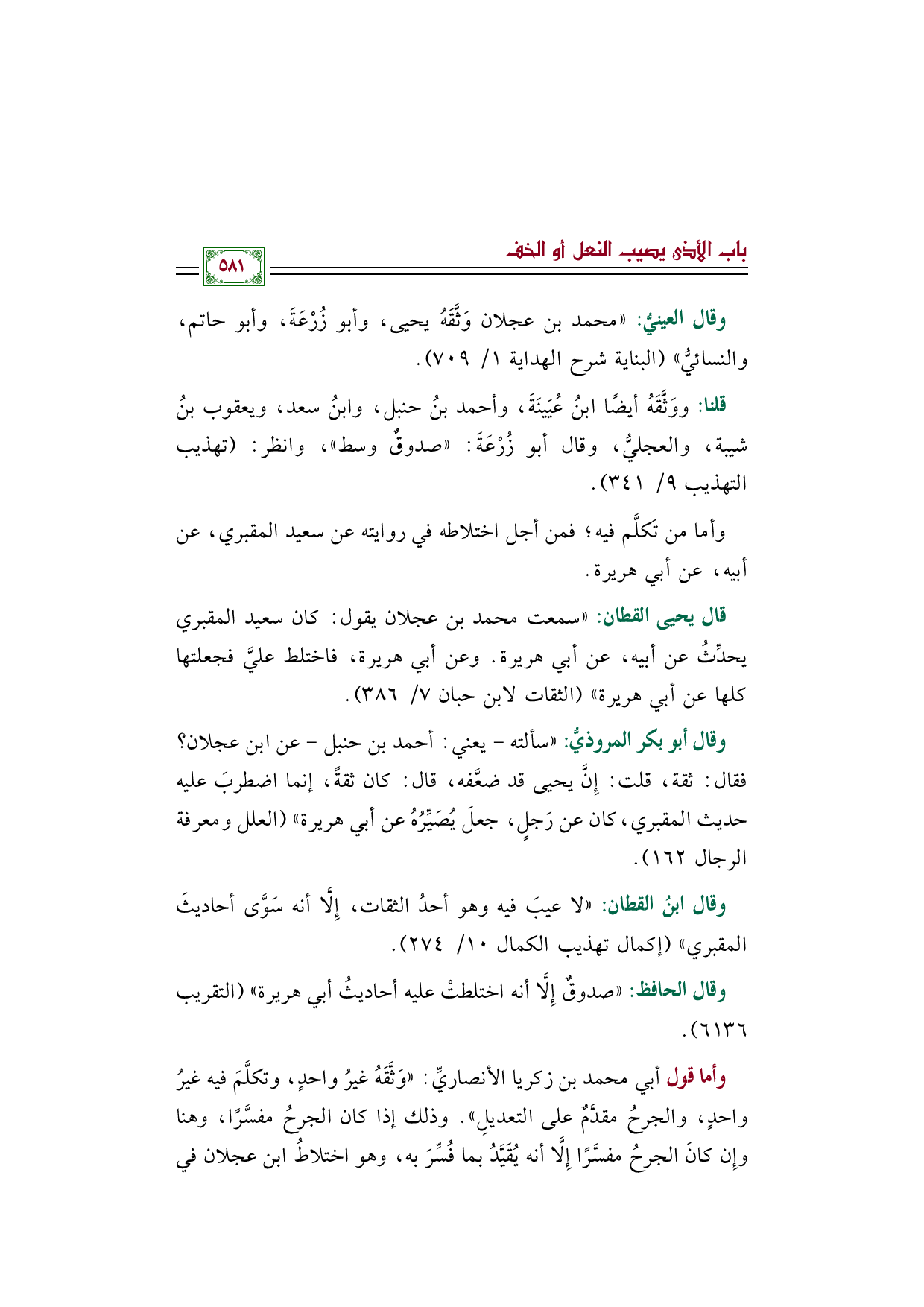 وقال أبو بكر المروذيُّ: ((سألته -يعني: أحمد بن حنبل- عن ابن عجلان؟ فقال: ثقة، قلت: إِنَّ يحيى قد ضعَّفه، قال: كان ثقةً، إنما اضطربَ عليه حديث المقبري، كان عن رَجلٍ، جعلَ يُصَيِّرُهُ عن أبي هريرة)) (العلل ومعرفة الرجال ١٦٢).