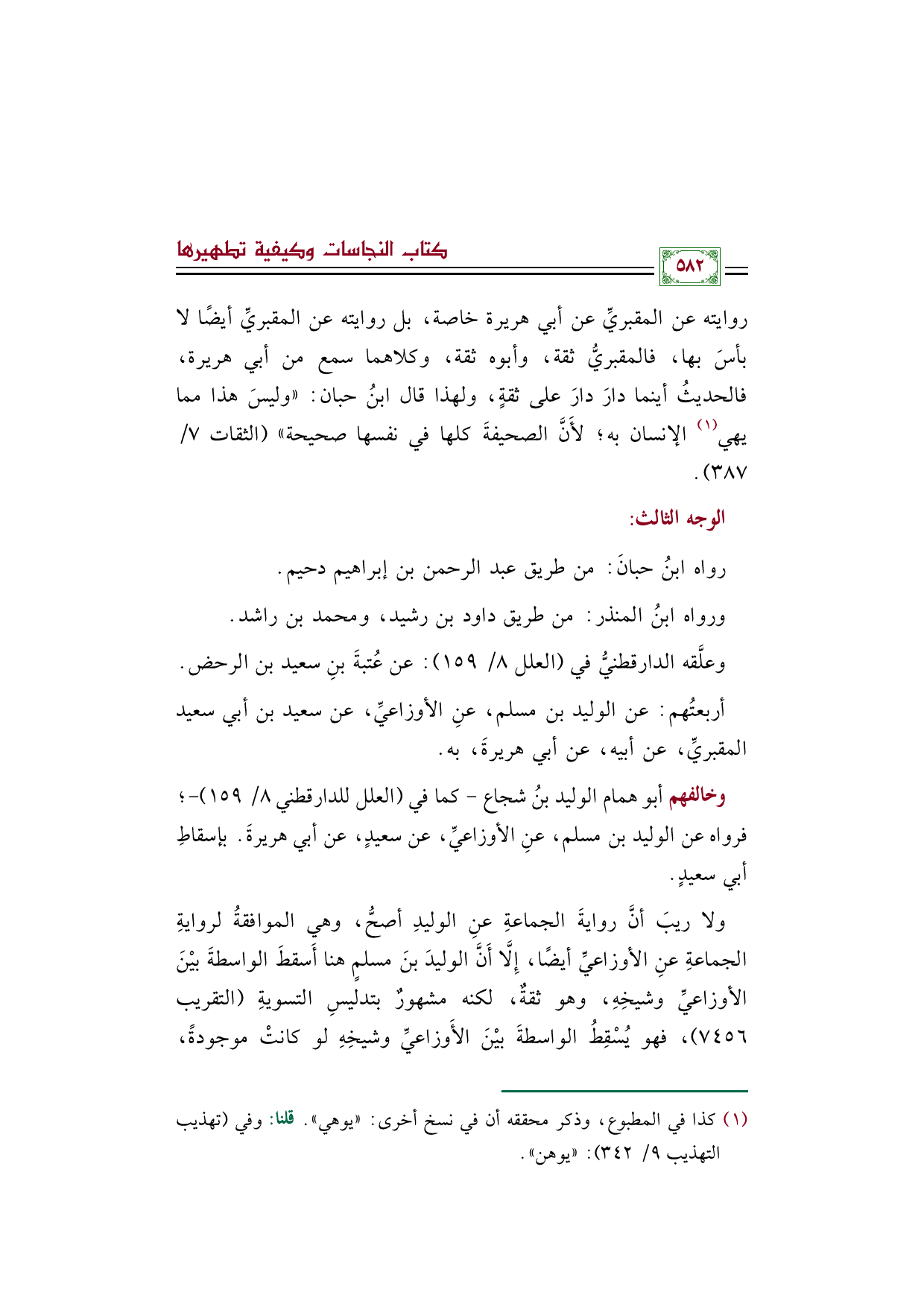 وخالفهم أبو همام الوليد بنُ شجاع -كما في (العلل للدارقطني ٨/ ١٥٩) -؛ فرواه عن الوليد بن مسلم، عنِ الأوزاعيِّ، عن سعيدٍ، عن أبي هريرةَ. بإسقاطِ أبي سعيدٍ.