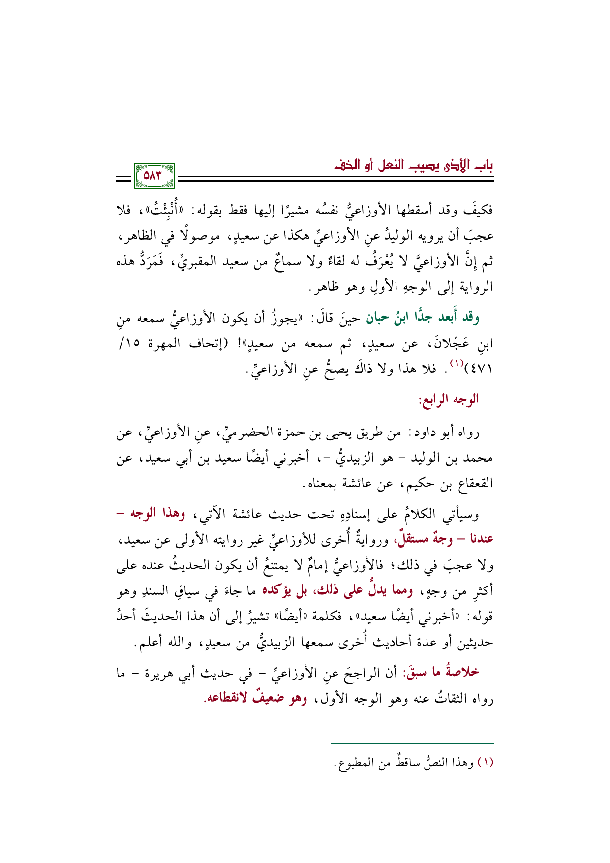 خلاصةُ ما سبقَ: أن الراجحَ عنِ الأوزاعيِّ -في حديث أبي هريرة- ما رواه الثقاتُ عنه وهو الوجه الأول، وهو ضعيفٌ لانقطاعه.