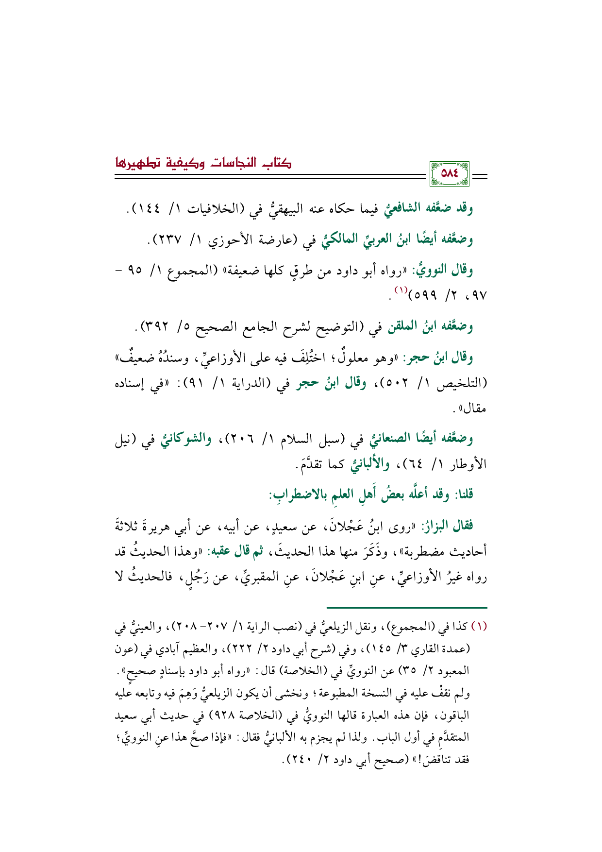 وضعَّفه أيضًا الصنعانيُّ في (سبل السلام ١/ ٢٠٦)، والشوكانيُّ في (نيل الأوطار ١/ ٦٤)، والألبانيُّ كما تقدَّمَ.