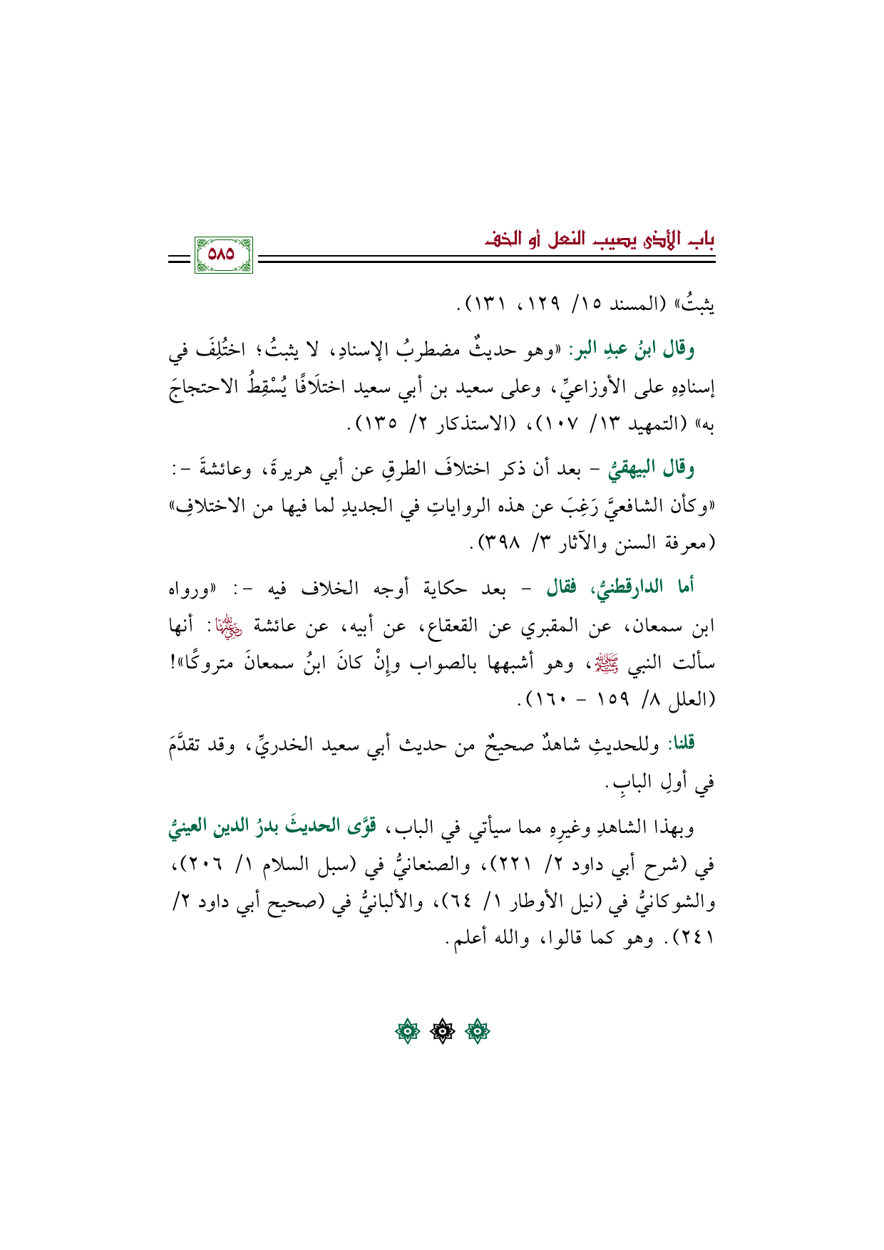 وقال البيهقيُّ -بعد أن ذكر اختلافَ الطرقِ عن أبي هريرةَ، وعائشةَ-: ((وكأن الشافعيَّ رَغِبَ عن هذه الرواياتِ في الجديدِ لما فيها من الاختلافِ)) (معرفة السنن والآثار ٣/ ٣٩٨).