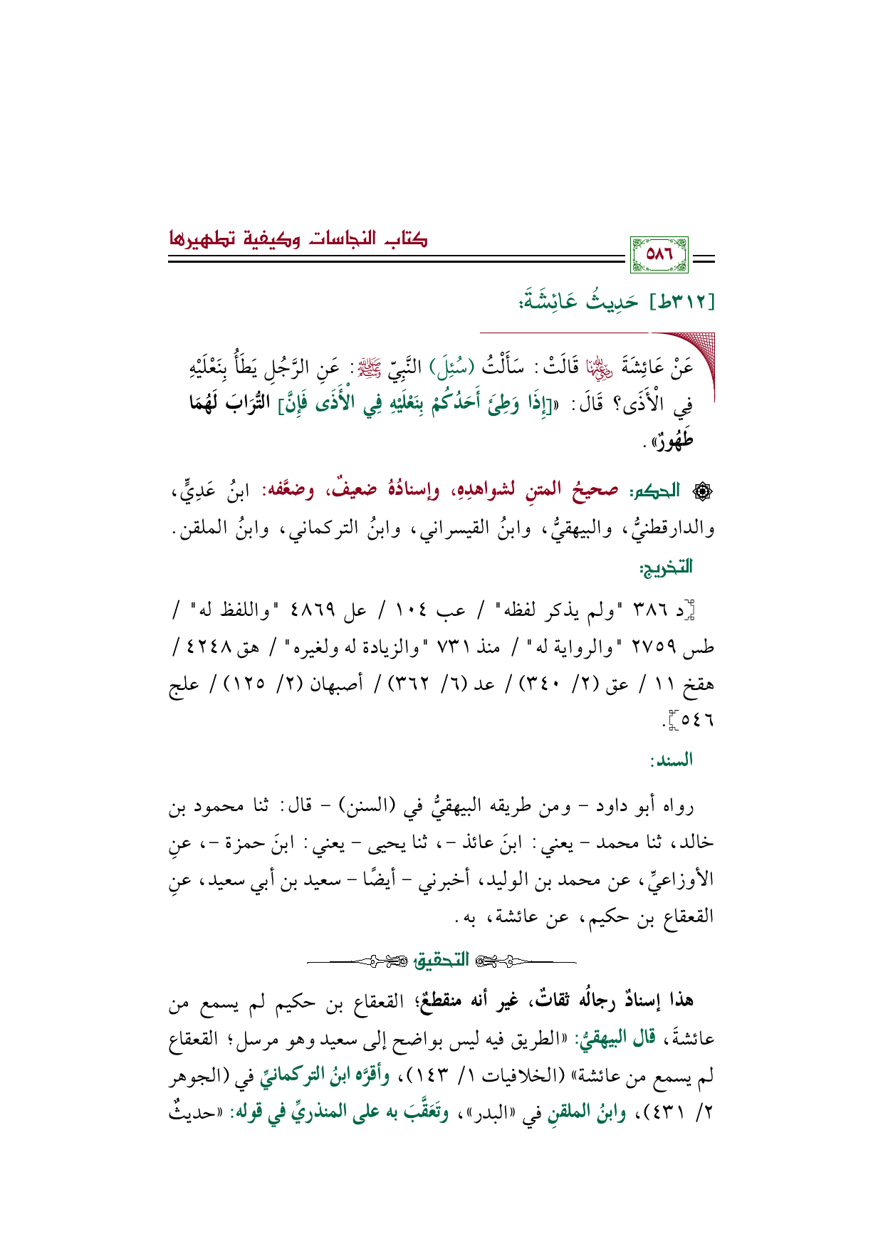رواه أبو داود -ومن طريقه البيهقيُّ في (السنن) - قال: ثنا محمود بن خالد، ثنا محمد -يعني: ابنَ عائذ-، ثنا يحيى -يعني: ابنَ حمزة-، عنِ الأوزاعيِّ، عن محمد بن الوليد، أخبرني -أيضًا- سعيد بن أبي سعيد، عنِ القعقاع بن حكيم، عن عائشة، به.