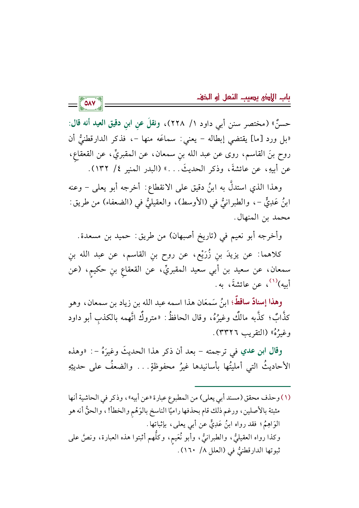 حسنٌ)) (مختصر سنن أبي داود ١/ ٢٢٨)، ونقلَ عنِ ابنِ دقيق العيد أنه قال: ((بل ورد [ما] يقتضي إبطاله -يعني: سماعَه منها-، فذكر الدارقطنيُّ أن روح بنَ القاسم، روى عن عبد الله بنِ سمعان، عن المقبريِّ، عن القعقاعِ، عن أبيهِ، عن عائشةَ، وذكر الحديثَ ... )) (البدر المنير ٤/ ١٣٢).