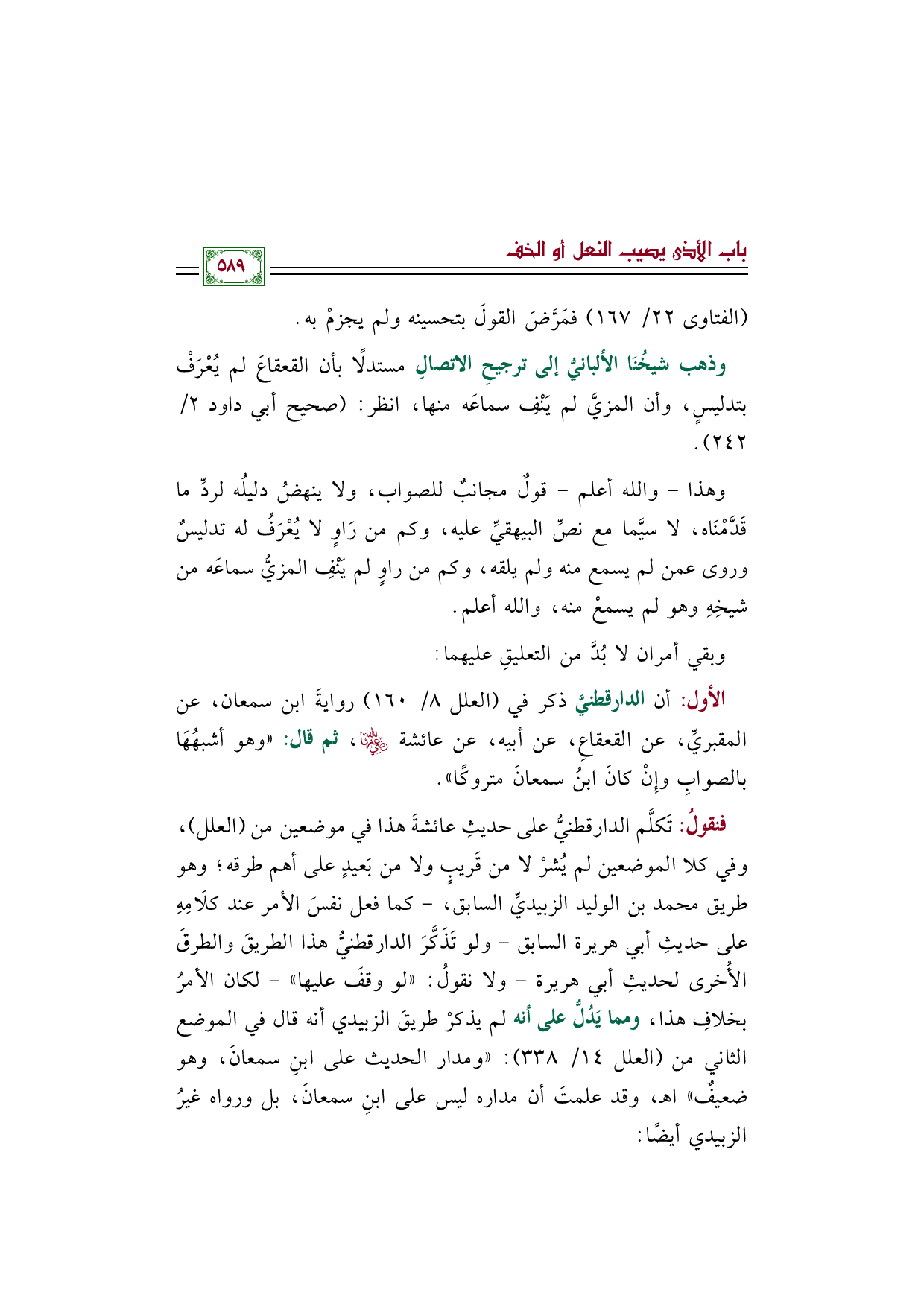 فنقولُ: تَكلَّم الدارقطنيُّ على حديثِ عائشةَ هذا في موضعين من (العلل)، وفي كلا الموضعين لم يُشرْ لا من قَريبٍ ولا من بَعيدٍ على أهم طرقه؛ وهو طريق محمد بن الوليد الزبيديِّ السابق، -كما فعل نفسَ الأمر عند كلَامِهِ على حديثِ أبي هريرة السابق- ولو تَذَكَّرَ الدارقطنيُّ هذا الطريقَ والطرقَ الأُخرى لحديثِ أبي هريرة -ولا نقولُ: ((لو وقفَ عليها)) - لكان الأمرُ بخلافِ هذا، ومما يَدُلُّ على أنه لم يذكرْ طريقَ الزبيدي أنه قال في الموضع الثاني من (العلل ١٤/ ٣٣٨): ((ومدار الحديث على ابنِ سمعانَ، وهو ضعيفٌ)) اهـ، وقد علمتَ أن مداره ليس على ابنِ سمعانَ، بل ورواه غيرُ الزبيدي أيضًا: