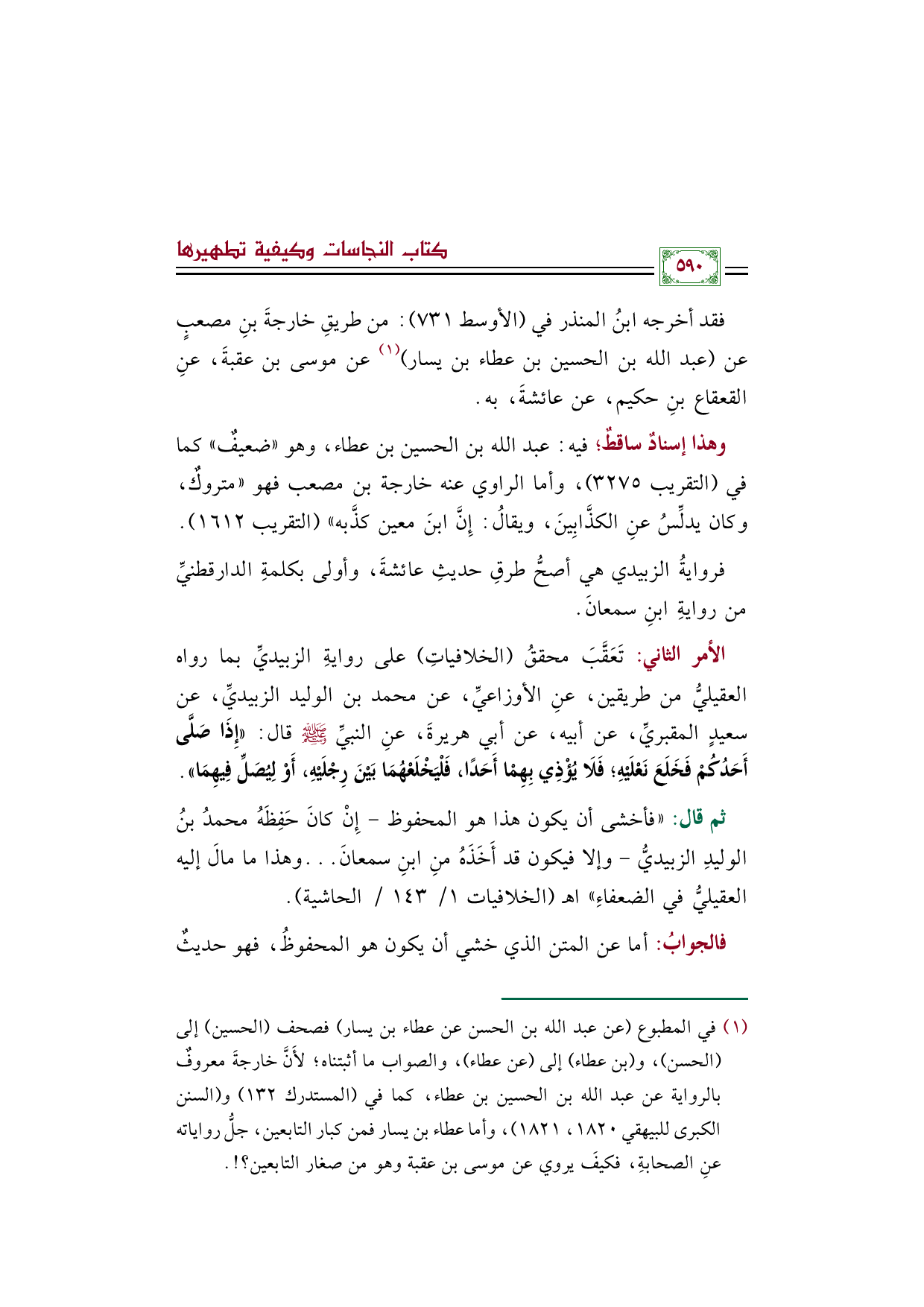 الأمر الثاني: تَعَقَّبَ محققُ (الخلافياتِ) على روايةِ الزبيديِّ بما رواه العقيليُّ من طريقين، عنِ الأوزاعيِّ، عن محمد بن الوليد الزبيديِّ، عن سعيدٍ المقبريِّ، عن أبيه، عن أبي هريرةَ، عنِ النبيِّ صلى الله عليه وسلم قال: ((إِذَا صَلَّى أَحَدُكُمْ فَخَلَعَ نَعْلَيْهِ؛ فَلَا يُؤْذِي بِهِمْا أَحَدًا، فَلْيَخْلَعْهُمَا بَيْنَ رِجْلَيْهِ، أَوْ لِيُصَلِّ فِيهِمَا)).