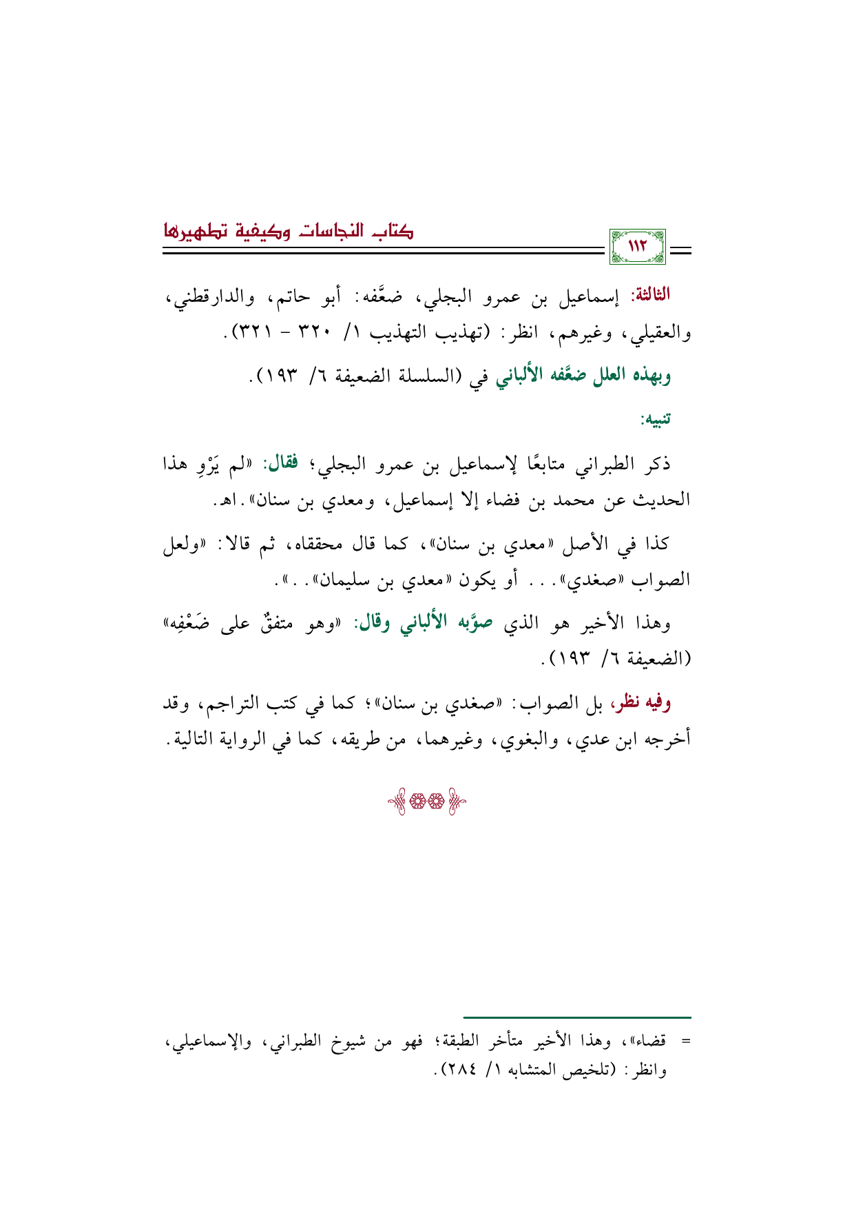 الثالثة: إسماعيل بن عمرو البجلي، ضعَّفه: أبو حاتم، والدارقطني، والعقيلي، وغيرهم، انظر: (تهذيب التهذيب ١/ ٣٢٠ - ٣٢١).