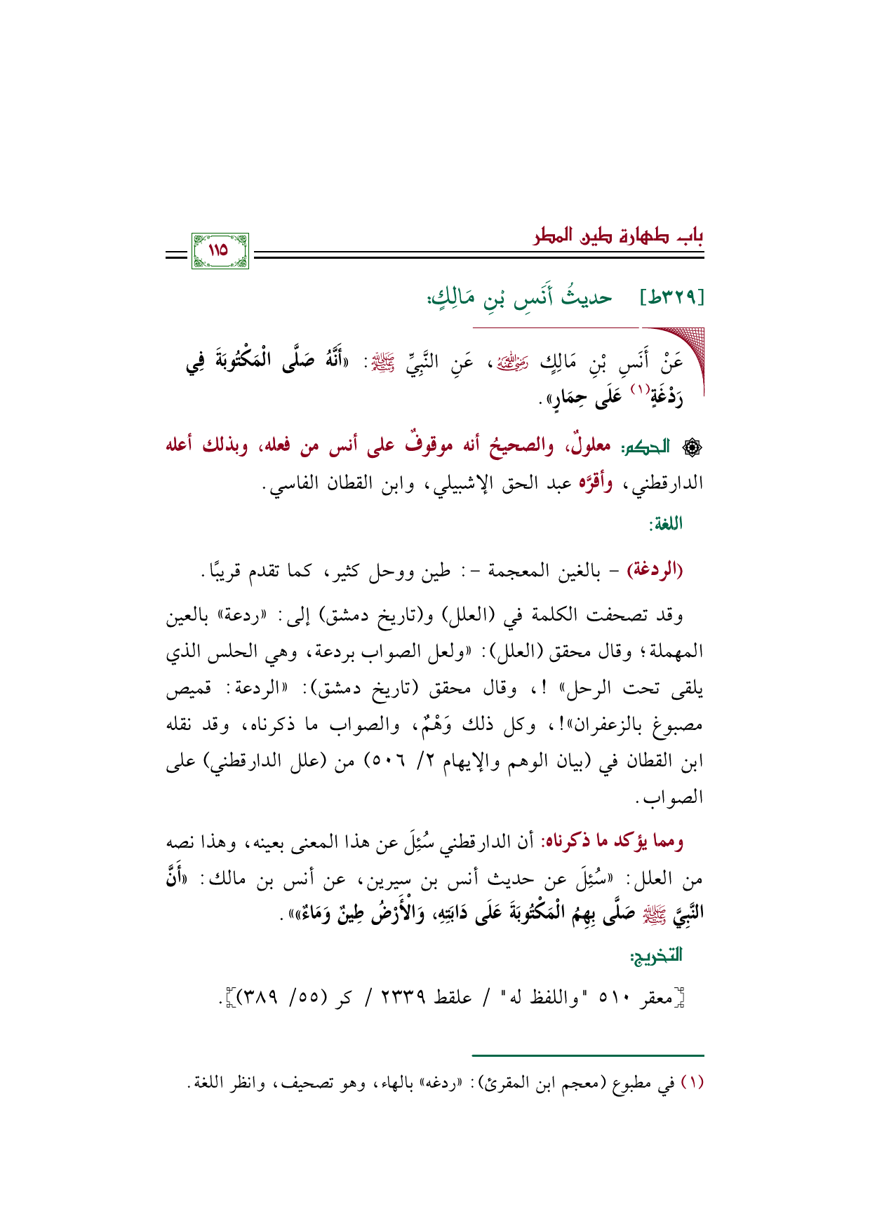 وقد تصحفت الكلمة في (العلل) و (تاريخ دمشق) إلى: ((ردعة)) بالعين المهملة؛ وقال محقق (العلل): ((ولعل الصواب بردعة، وهي الحلس الذي يلقى تحت الرحل))! ، وقال محقق (تاريخ دمشق): ((الردعة: قميص مصبوغ بالزعفران))! ، وكل ذلك وَهْمٌ، والصواب ما ذكرناه، وقد نقله ابن القطان في (بيان الوهم والإيهام ٢/ ٥٠٦) من (علل الدارقطني) على الصواب.