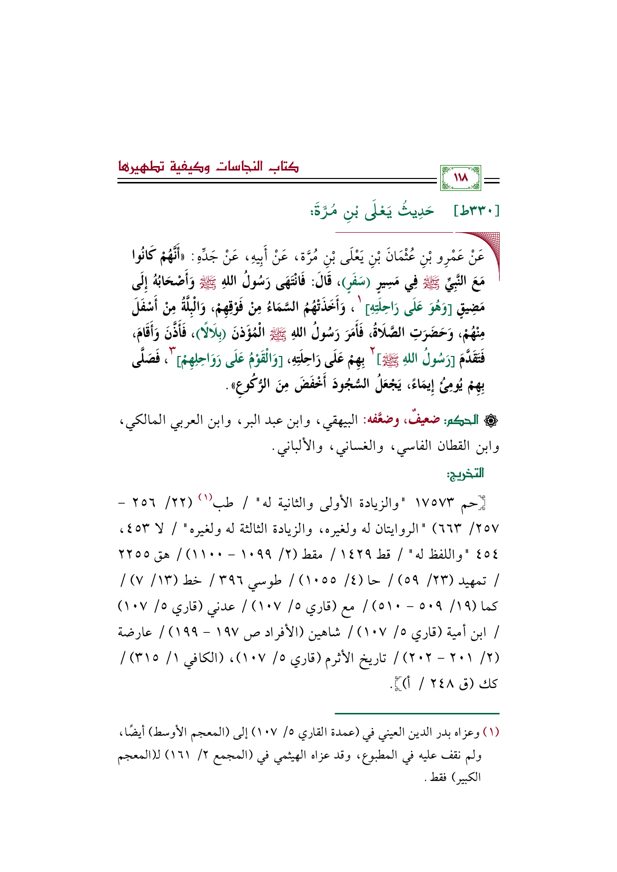 ◼ عَنْ عَمْرِو بْنِ عُثْمَانَ بْنِ يَعْلَى بْنِ مُرَّة، عَنْ أَبِيهِ، عَنْ جَدِّهِ: ((أَنَّهُمْ كَانُوا مَعَ النَّبِيِّ صلى الله عليه وسلم فِي مَسِيرٍ (سَفَرٍ)، قَالَ: فَانْتَهَى رَسُولُ اللهِ صلى الله عليه وسلم وَأَصْحَابُهُ إِلَى مَضِيقٍ [وَهُوَ عَلَى رَاحِلَتِهِ] ١، وَأَخَذَتْهُمُ السَّمَاءُ مِنْ فَوْقِهِمْ، وَالْبِلَّةُ مِنْ أَسْفَلَ مِنْهُمْ، وَحَضَرَتِ الصَّلَاةُ، فَأَمَرَ رَسُولُ اللهِ صلى الله عليه وسلم الْمُؤَذنَ (بِلَالًا)، فَأَذَّنَ وَأَقَامَ، فَتَقَدَّمَ [رَسُولُ اللهِ صلى الله عليه وسلم] ٢ بِهِمْ عَلَى رَاحِلَتِهِ، [وَالْقَوْمُ عَلَى رَوَاحِلِهِمْ] ٣، فَصَلَّى بِهِمْ يُومِئُ إِيمَاءً، يَجْعَلُ السُّجُودَ أَخْفَضَ مِنَ الرُّكُوعِ)).