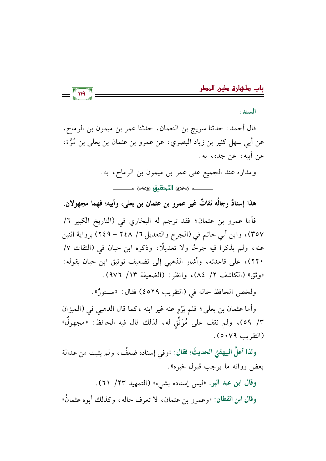 وقال ابن القطان: ((وعمرو بن عثمان، لا تعرف حاله، وكذلك أبوه عثمانُ))