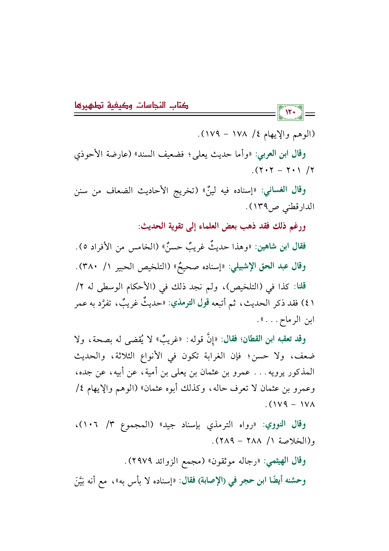 وقد تعقبه ابن القطان؛ فقال: ((إِنَّ قوله: ((غريبٌ)) لا يُقضى له بصحة، ولا ضعف، ولا حسن؛ فإن الغرابة تكون في الأنواع الثلاثة، والحديث المذكور يرويه ... عمرو بن عثمان بن يعلى بن أمية، عن أبيه، عن جده، وعمرو بن عثمان لا تعرف حاله، وكذلك أبوه عثمان)) (الوهم والإيهام ٤/ ١٧٨ - ١٧٩).