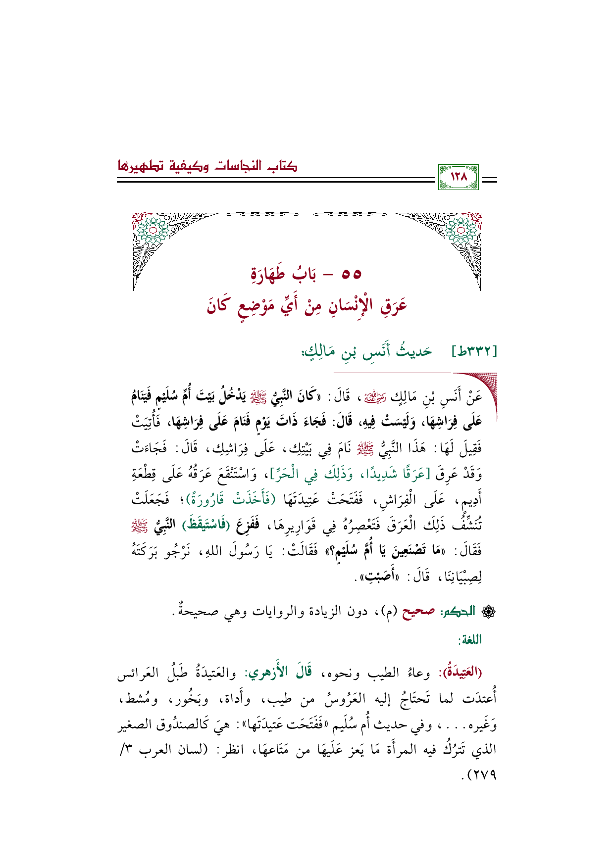 ◼ عَنْ أَنَسِ بْنِ مَالِكٍ رضي الله عنه، قَالَ: ((كَانَ النَّبِيُّ صلى الله عَليه وسلم يَدْخُلُ بَيْتَ أُمِّ سُلَيْمٍ فَيَنَامُ عَلَى فِرَاشِهَا، وَلَيْسَتْ فِيهِ، قَالَ: فَجَاءَ ذَاتَ يَوْمٍ فَنَامَ عَلَى فِرَاشِهَا، فَأُتِيَتْ فَقِيلَ لَهَا: هَذَا النَّبِيُّ صلى الله عليه وسلم نَامَ فِي بَيْتِكِ، عَلَى فِرَاشِكِ، قَالَ: فَجَاءَتْ وَقَدْ عَرِقَ [عَرَقًا شَدِيدًا، وَذَلِكَ فِي الْحَرِّ]، وَاسْتَنْقَعَ عَرَقُهُ عَلَى قِطْعَةِ أَدِيمٍ، عَلَى الْفِرَاشِ، فَفَتَحَتْ عَتِيدَتَهَا (فَأَخَذَتْ قَارُورَةً)؛ فَجَعَلَتْ تُنَشِّفُ ذَلِكَ الْعَرَقَ فَتَعْصِرُهُ فِي قَوَارِيرِهَا، فَفَزِعَ (فَاسْتَيقَظَ) النَّبِيُّ صلى الله عليه وسلم فَقَالَ: ((مَا تَصْنَعِينَ يَا أُمَّ سُلَيْمٍ؟ )) فَقَالَتْ: يَا رَسُولَ اللهِ، نَرْجُو بَرَكَتَهُ لِصِبْيَانِنَا، قَالَ: ((أَصَبْتِ)).