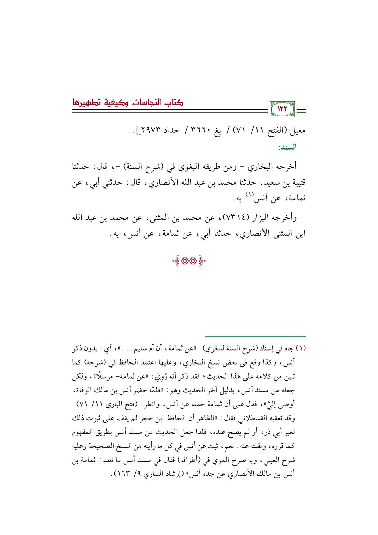 (¬١) جاء في إسناد (شرح السنة للبغوي): ((عن ثمامة، أن أم سليم ... ))، أي: بدون ذكر أنس، وكذا وقع في بعض نسخ البخاري، وعليها اعتمد الحافظ في (شرحه) كما تبين من كلامه على هذا الحديث؛ فقد ذكر أنه رُوِيَ: ((عن ثمامة- مرسلًا))، ولكن جعله من مسند أنس، بدليل آخر الحديث وهو: ((فلمَّا حضر أنس بن مالك الوفاة، أوصى إليَّ))، فدل على أن ثمامة حمله عن أنس، وانظر: (فتح الباري ١١/ ٧١).