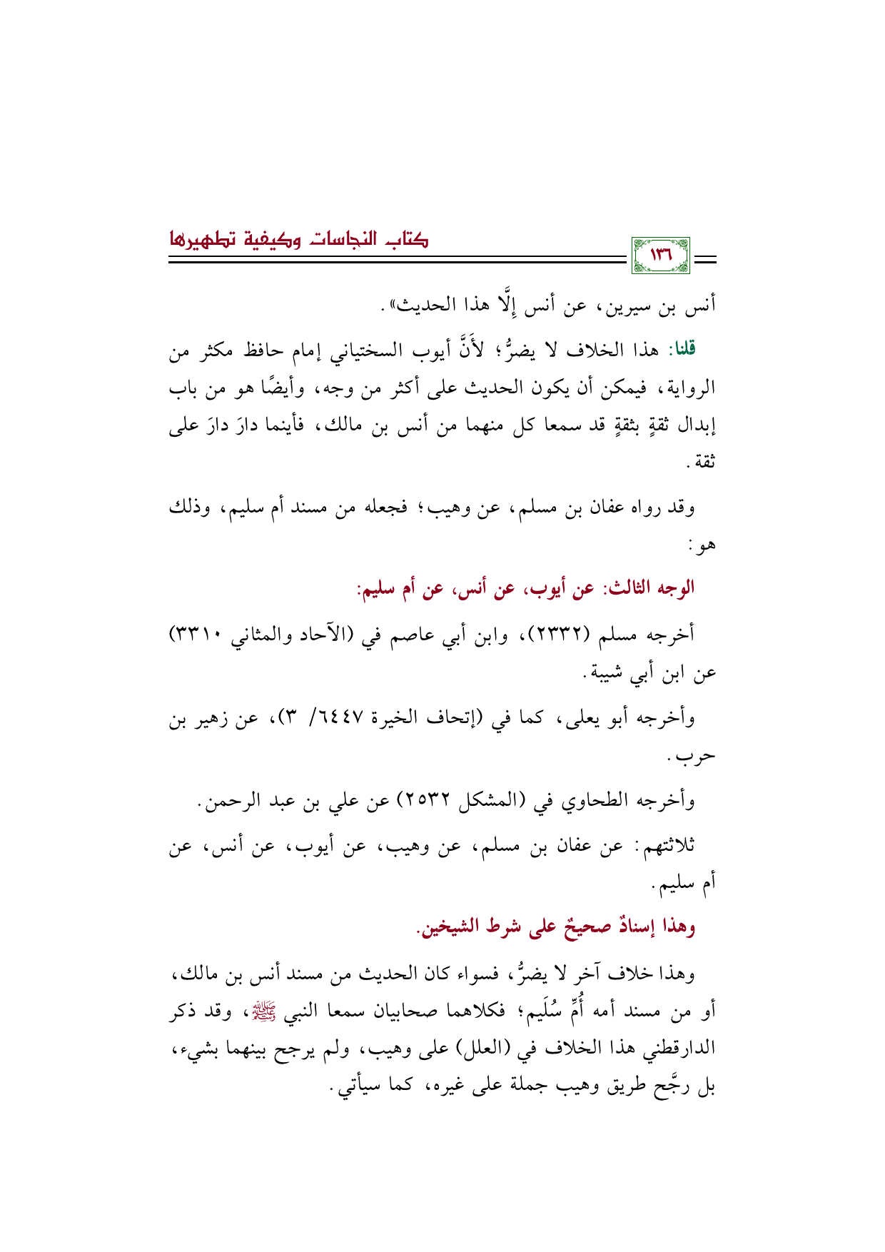 وهذا خلاف آخر لا يضرُّ، فسواء كان الحديث من مسند أنس بن مالك، أو من مسند أمه أُمِّ سُلَيم؛ فكلاهما صحابيان سمعا النبي صلى الله عليه وسلم، وقد ذكر الدارقطني هذا الخلاف في (العلل) على وهيب، ولم يرجح بينهما بشيء، بل رجَّح طريق وهيب جملة على غيره، كما سيأتي.