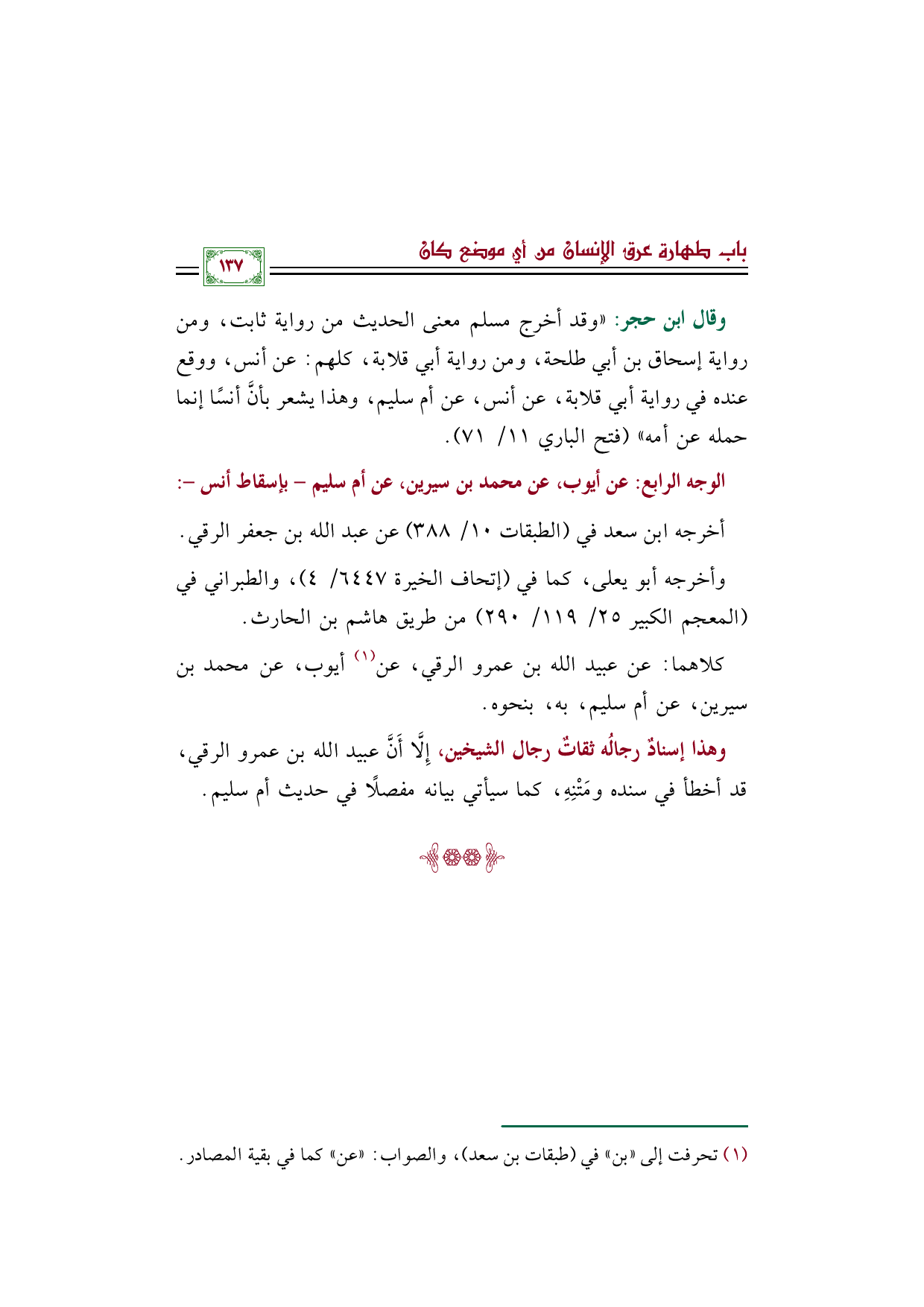 وقال ابن حجر: ((وقد أخرج مسلم معنى الحديث من رواية ثابت، ومن رواية إسحاق بن أبي طلحة، ومن رواية أبي قلابة، كلهم: عن أنس، ووقع عنده في رواية أبي قلابة، عن أنس، عن أم سليم، وهذا يشعر بأنَّ أنسًا إنما حمله عن أمه)) (فتح الباري ١١/ ٧١).