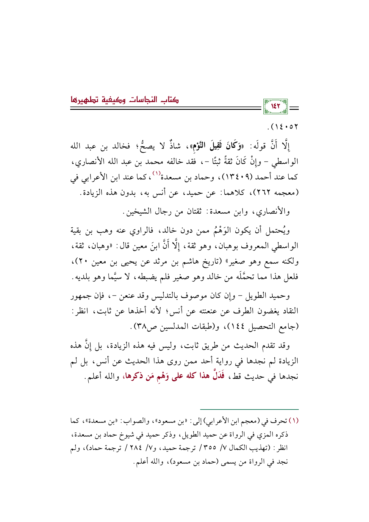 إِلَّا أَنَّ قولَه: ((وَكَانَ ثَقِيلَ النَّوْمِ))، شاذٌ لا يصحُّ؛ فخالد بن عبد الله الواسطي -وإِنْ كَانَ ثقةً ثبتًا-، فقد خالفه محمد بن عبد الله الأنصاري، كما عند أحمد (١٣٤٠٩)، وحماد بن مسعدة (¬١)، كما عند ابن الأعرابي في (معجمه ٢٦٢)، كلاهما: عن حميد، عن أنس به، بدون هذه الزيادة.
